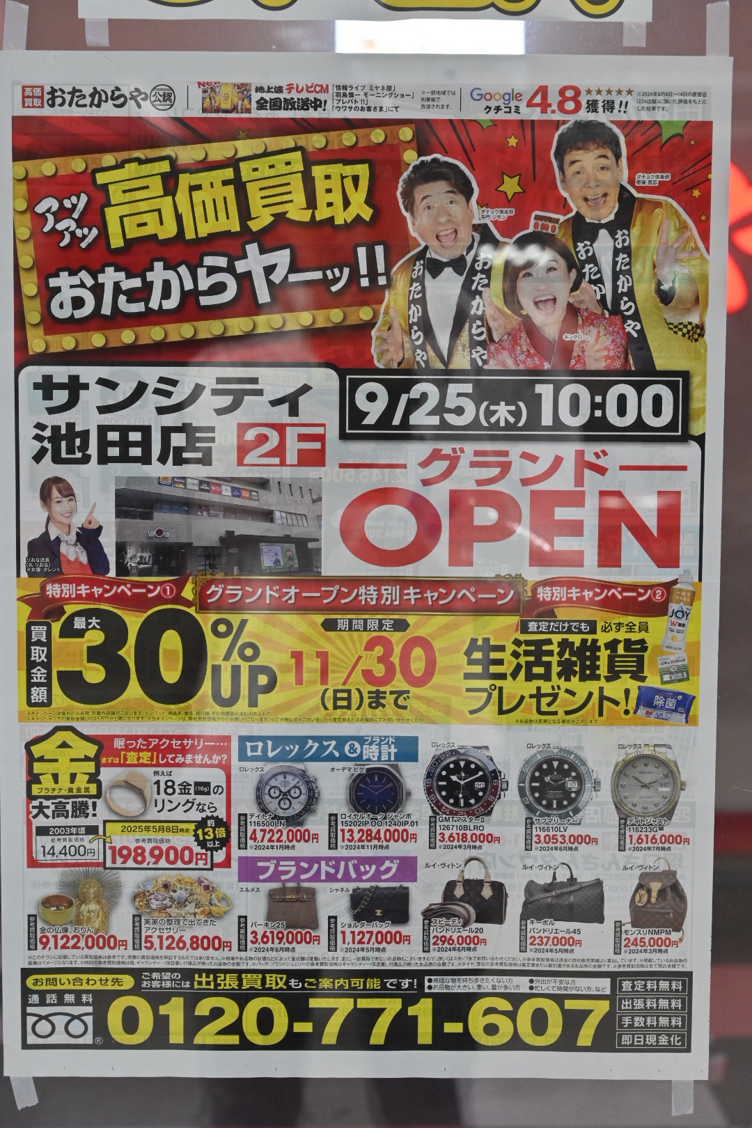 9/25(木)、池田駅前のサンシティ2階におたからやサンシティ池田店ができたみたいです。