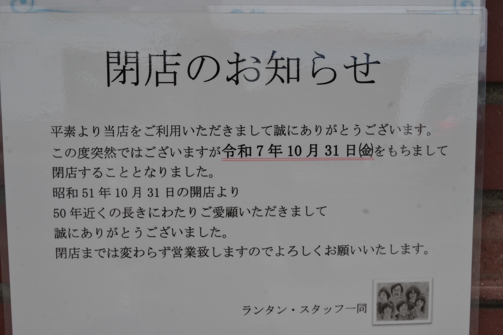 2025年10月31日(金)で閉店する告知が店頭に貼ってあります。