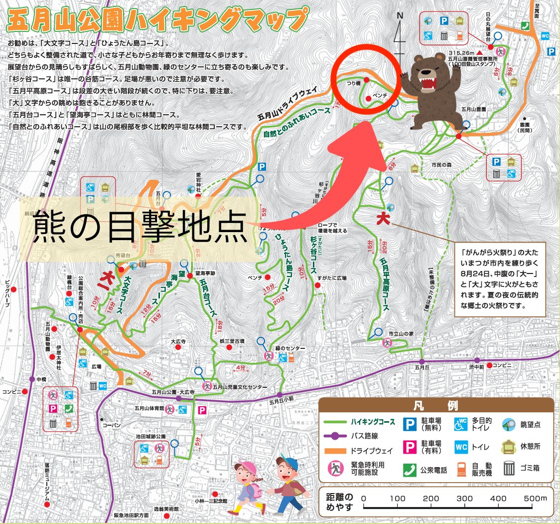 気になる目撃現場となる五月山公園ハイキングマップに目印を記しました。