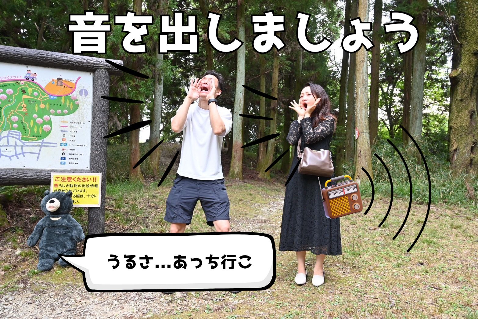 鈴を鳴らしたり、声を出したり歌ったり、ラジオをかけたりと、音を出して自分の存在を熊に知らせましょう。