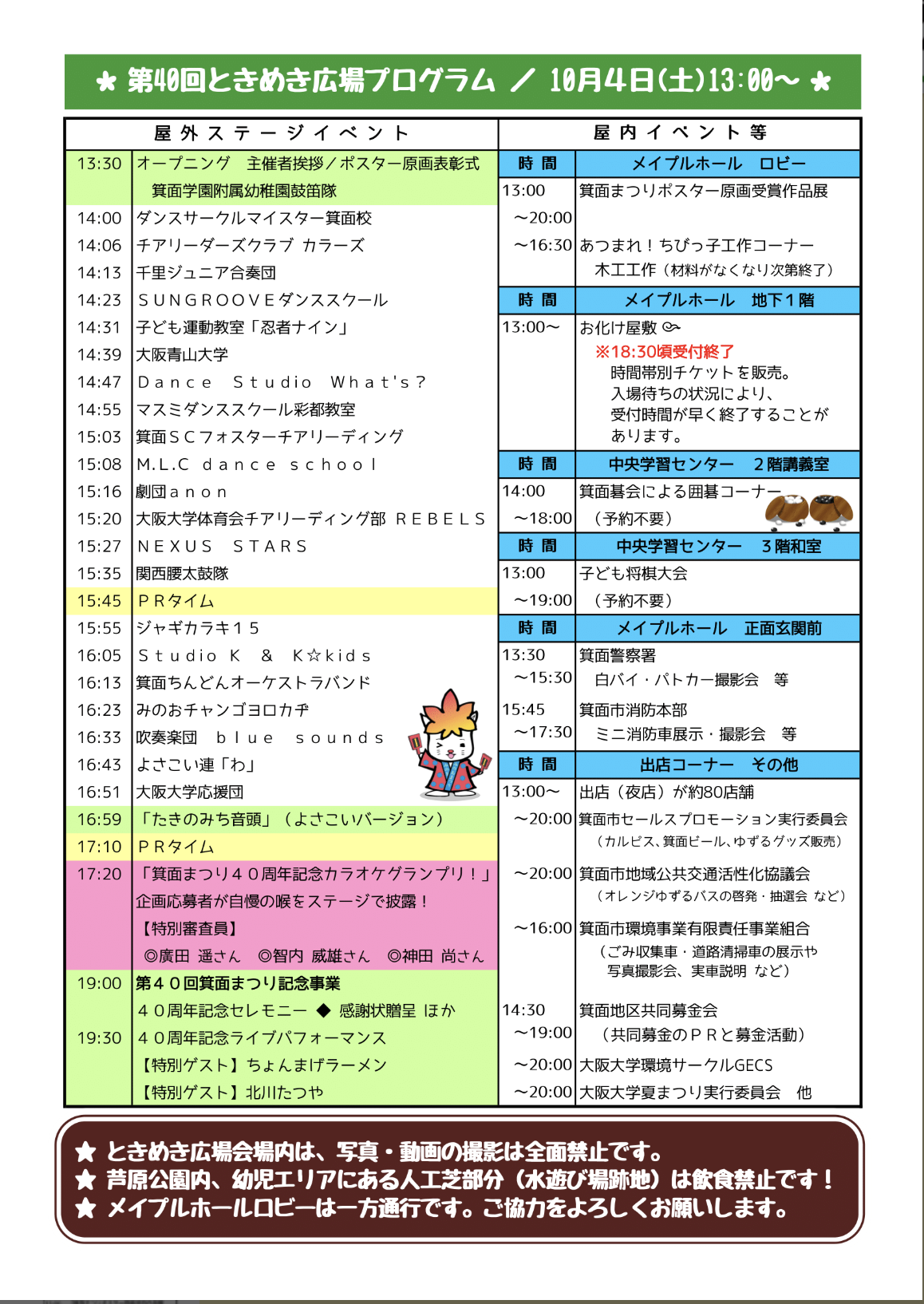 10/4(土)5(日)、箕面市芦原公園で第40回 箕面まつりが開催されるようです!