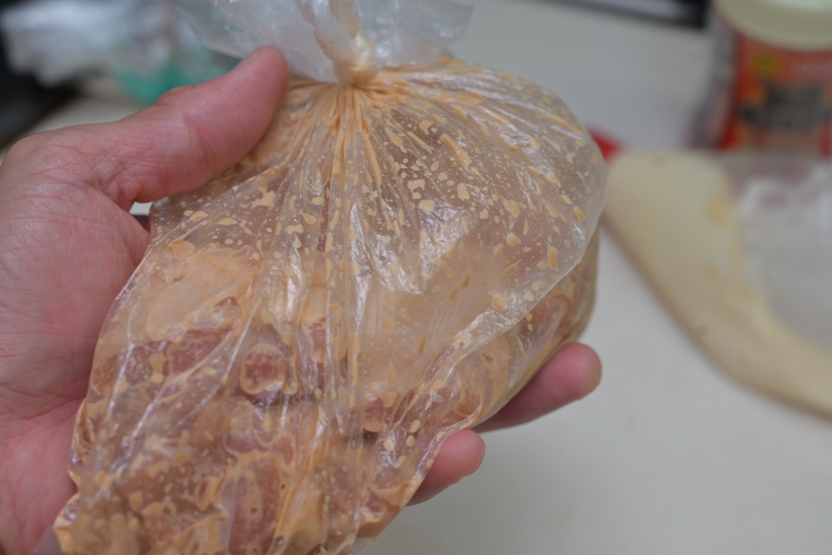 という事で、ビニールに鶏肉を入れて、マヨネーズや塩胡椒、醤油、にんにくなどを入れてしっかり馴染ませます。