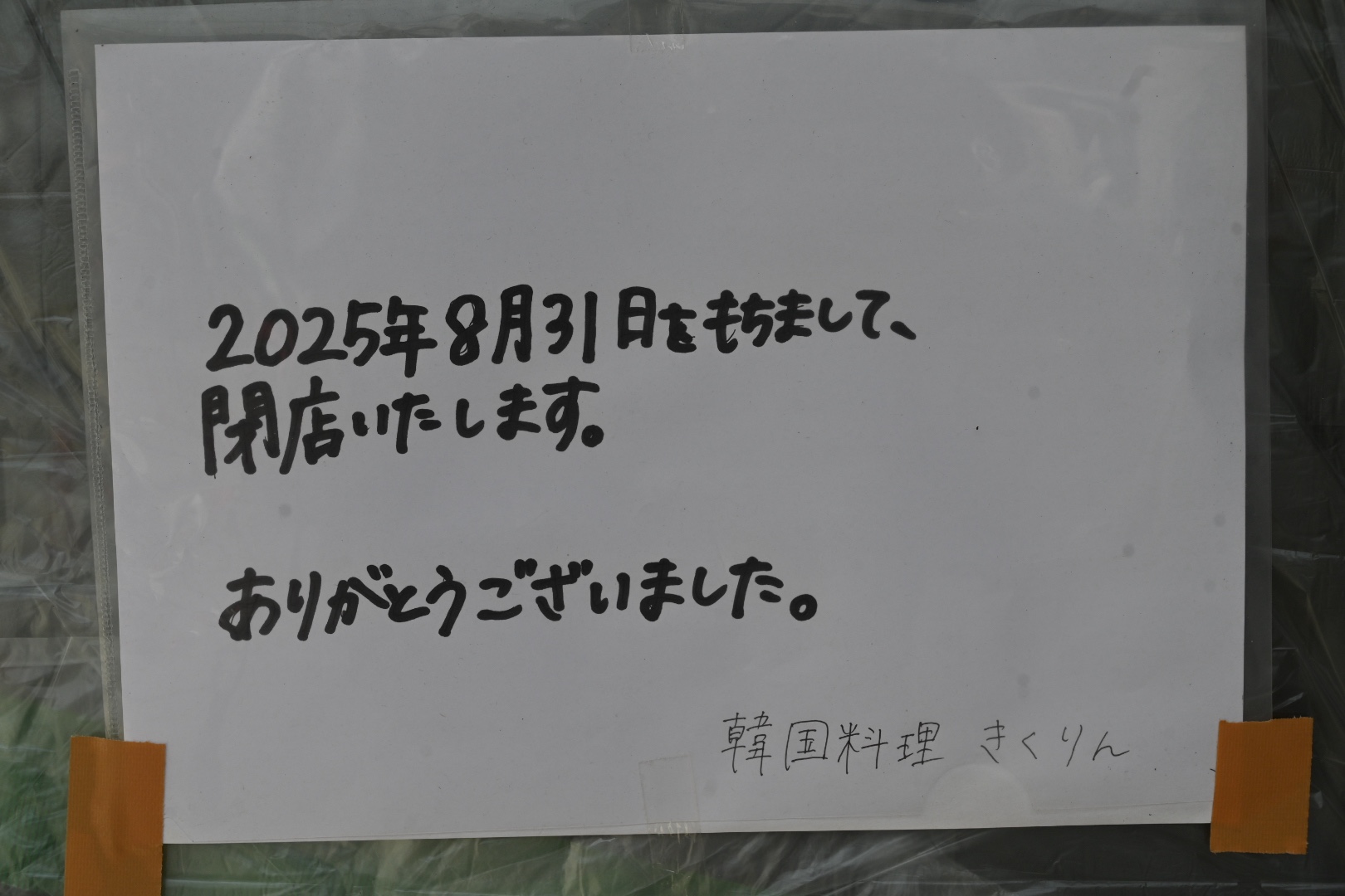 石橋阪大前駅西側の韓国料理きくりんが8/31で閉店したようです。