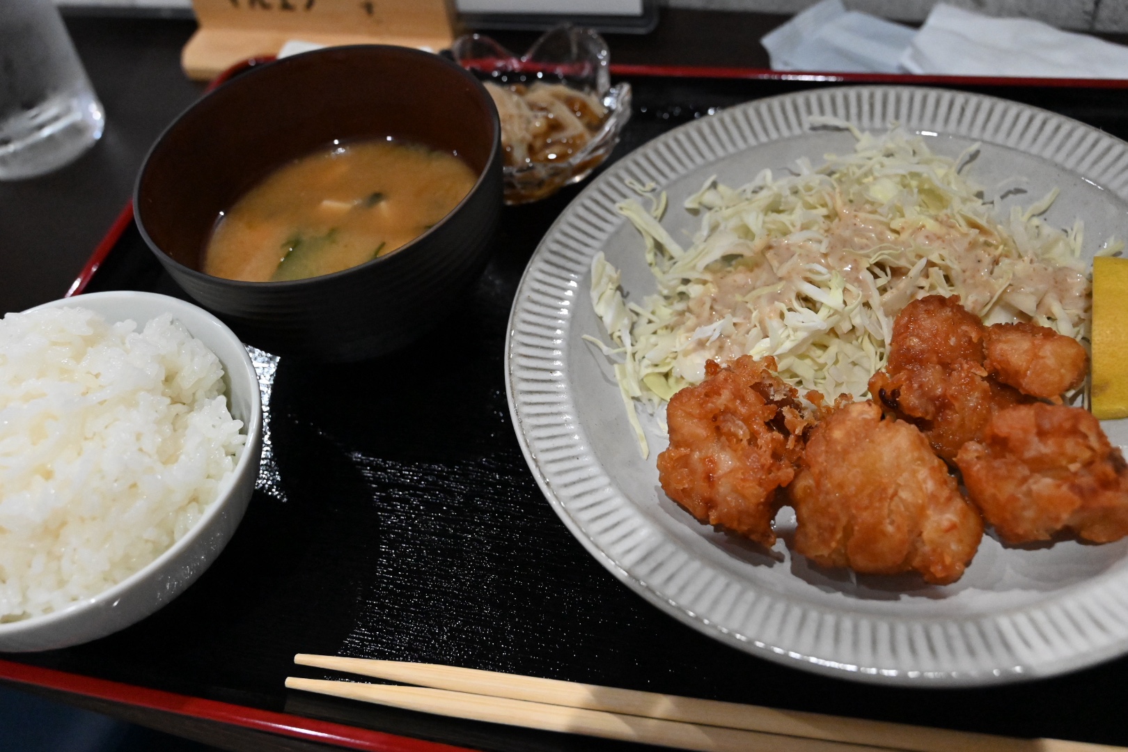 唐揚げ4個、ご飯、お漬物、小鉢、お味噌汁がついて¥800。