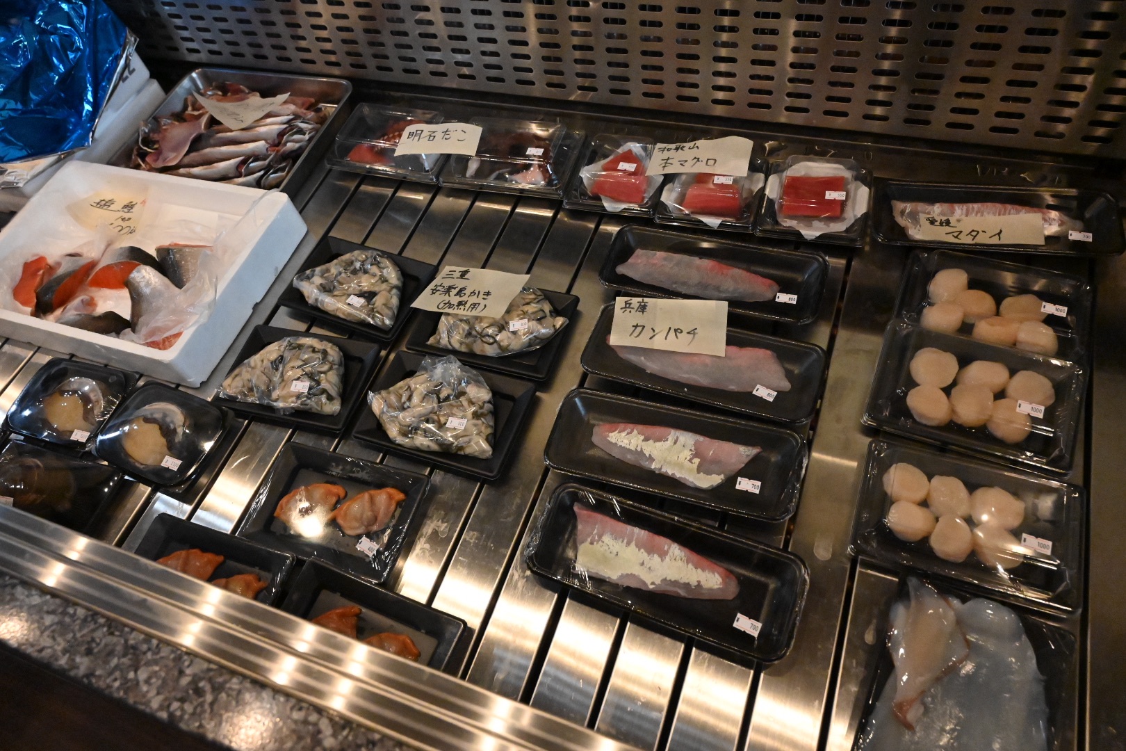 ショーケースには中央卸売市場で仕入れてきた海鮮が並びます。