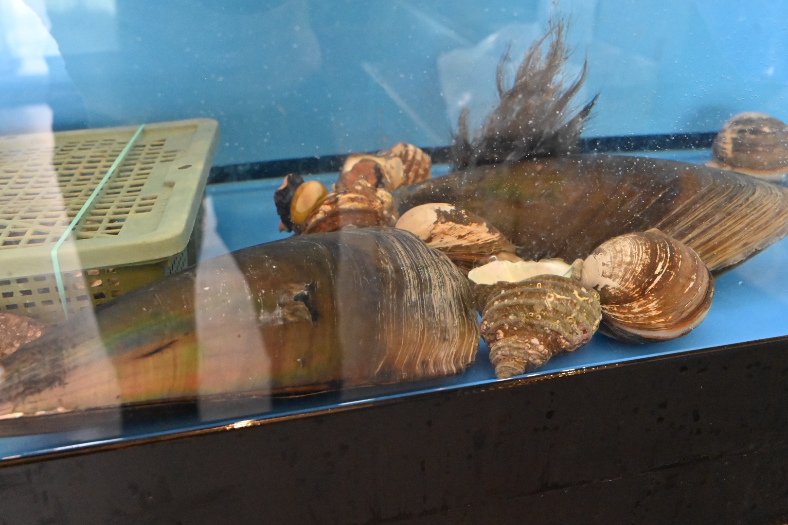 お店の一番奥にはでっかい水槽があって、貝が鎮座。