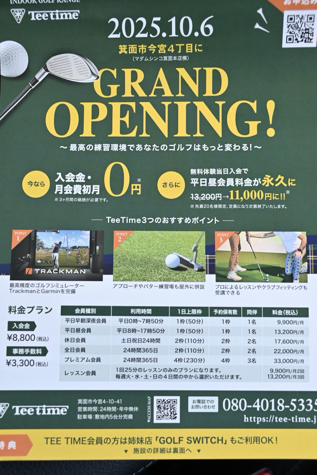 10/6(月)、箕面市今宮にTee timeっていうおしゃれなカフェみたいな24時間365日営業のゴルフ練習場がオープンしたみたい。