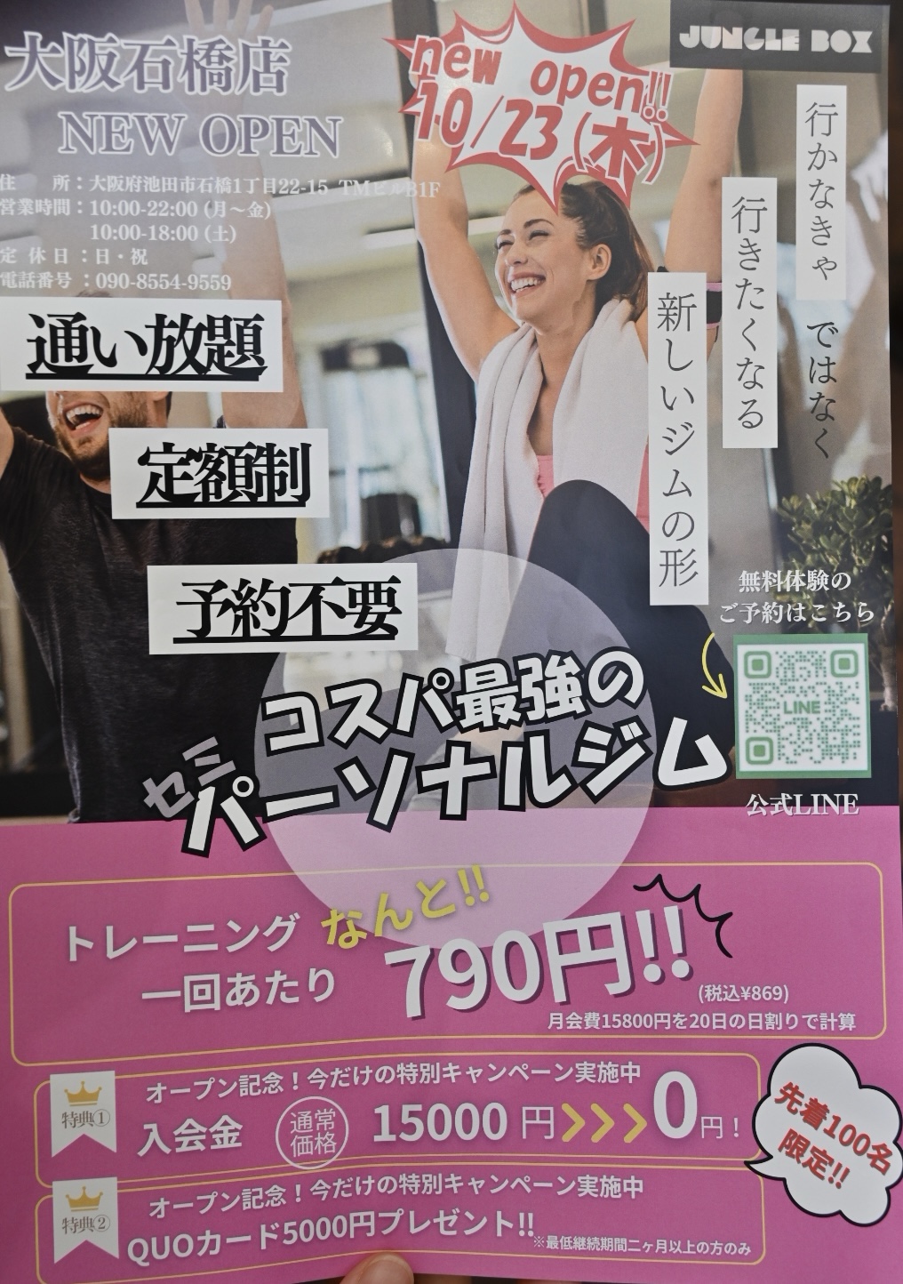 10/23(木)、JUNGLE BOX大阪石橋店っていうパーソナルジムができるようです。