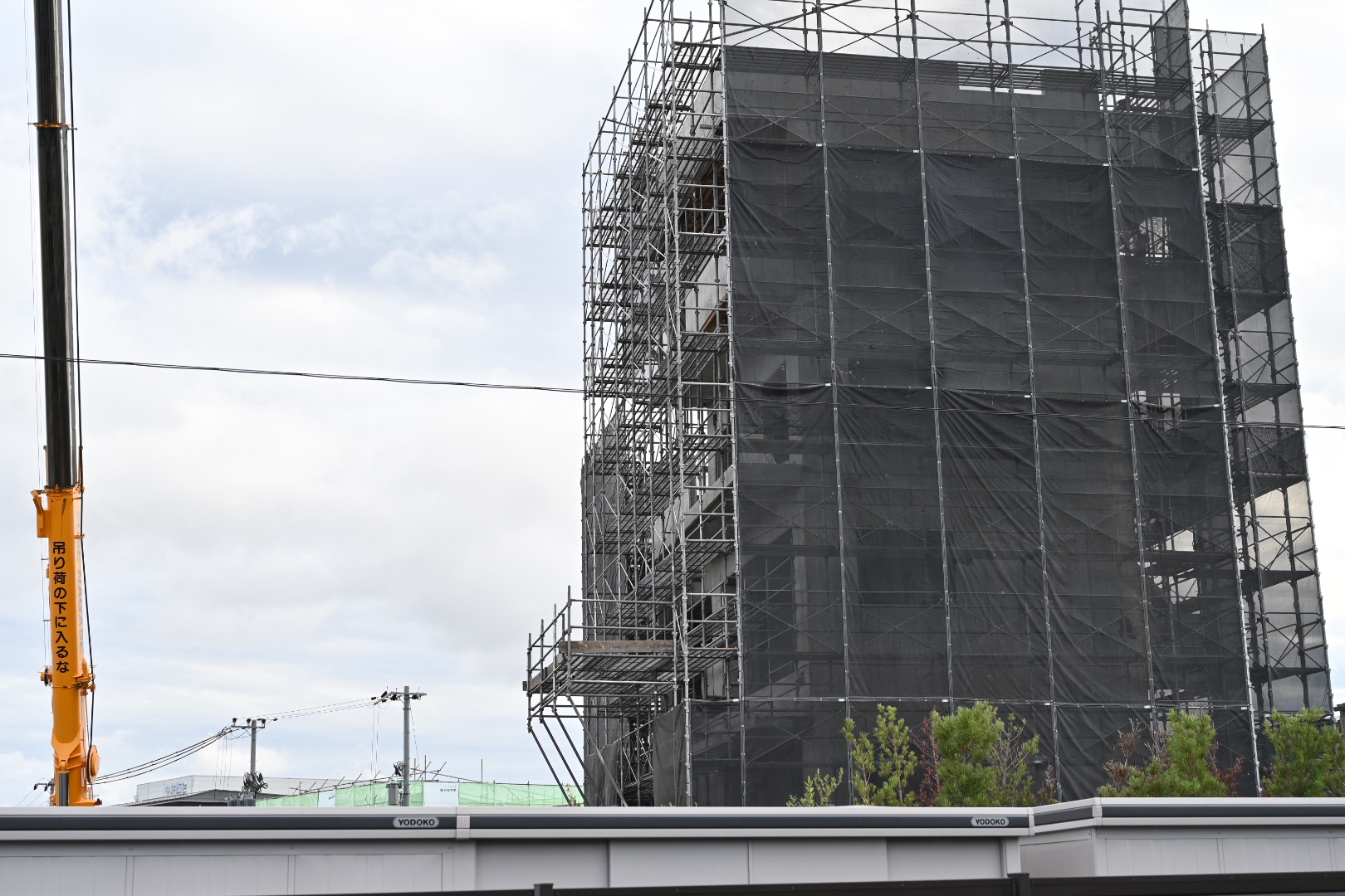 足場がぐるっと周りを囲んでいて、東側の建屋は外観がはっきり分かるまで、もうちょっと時間がかかりそう。