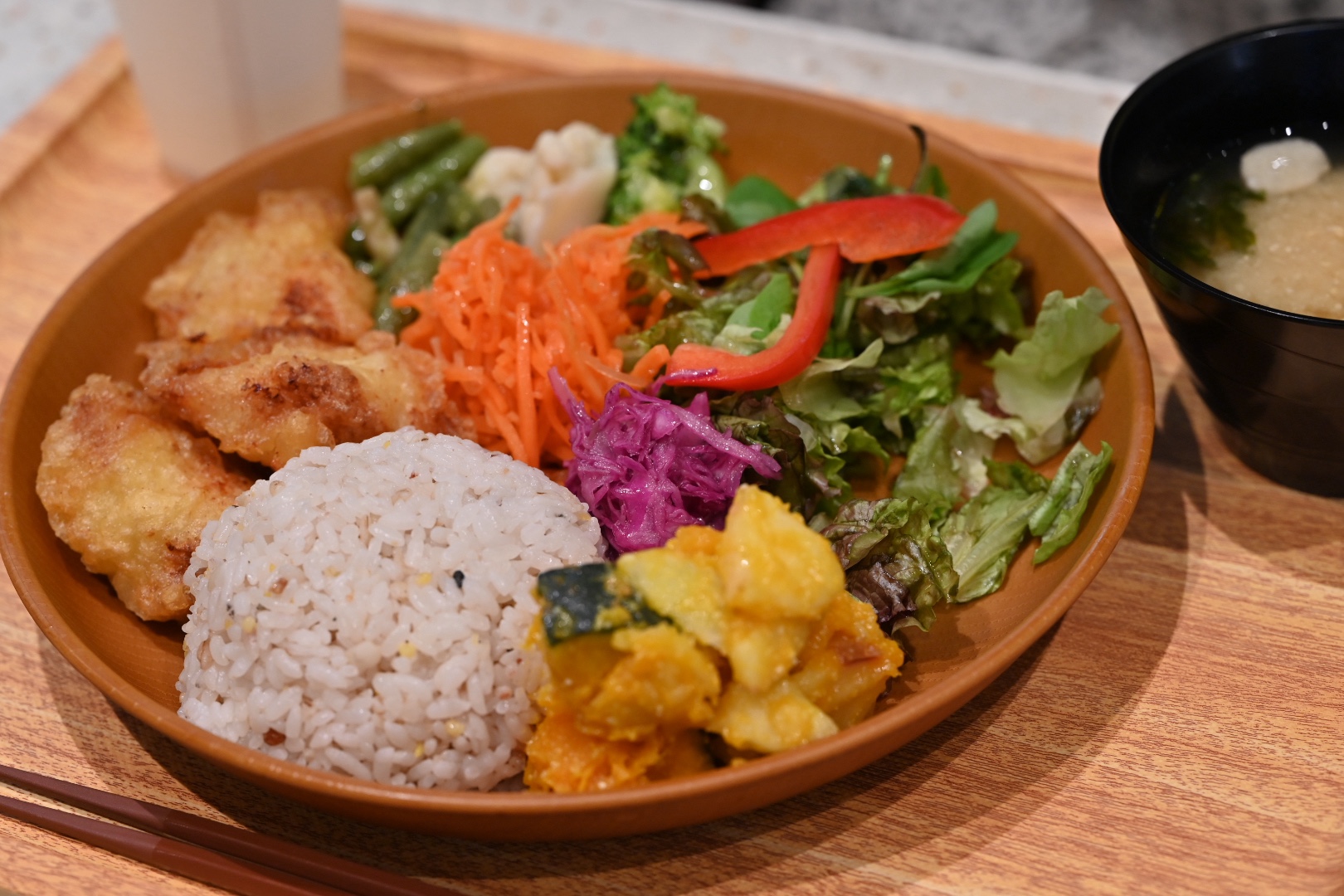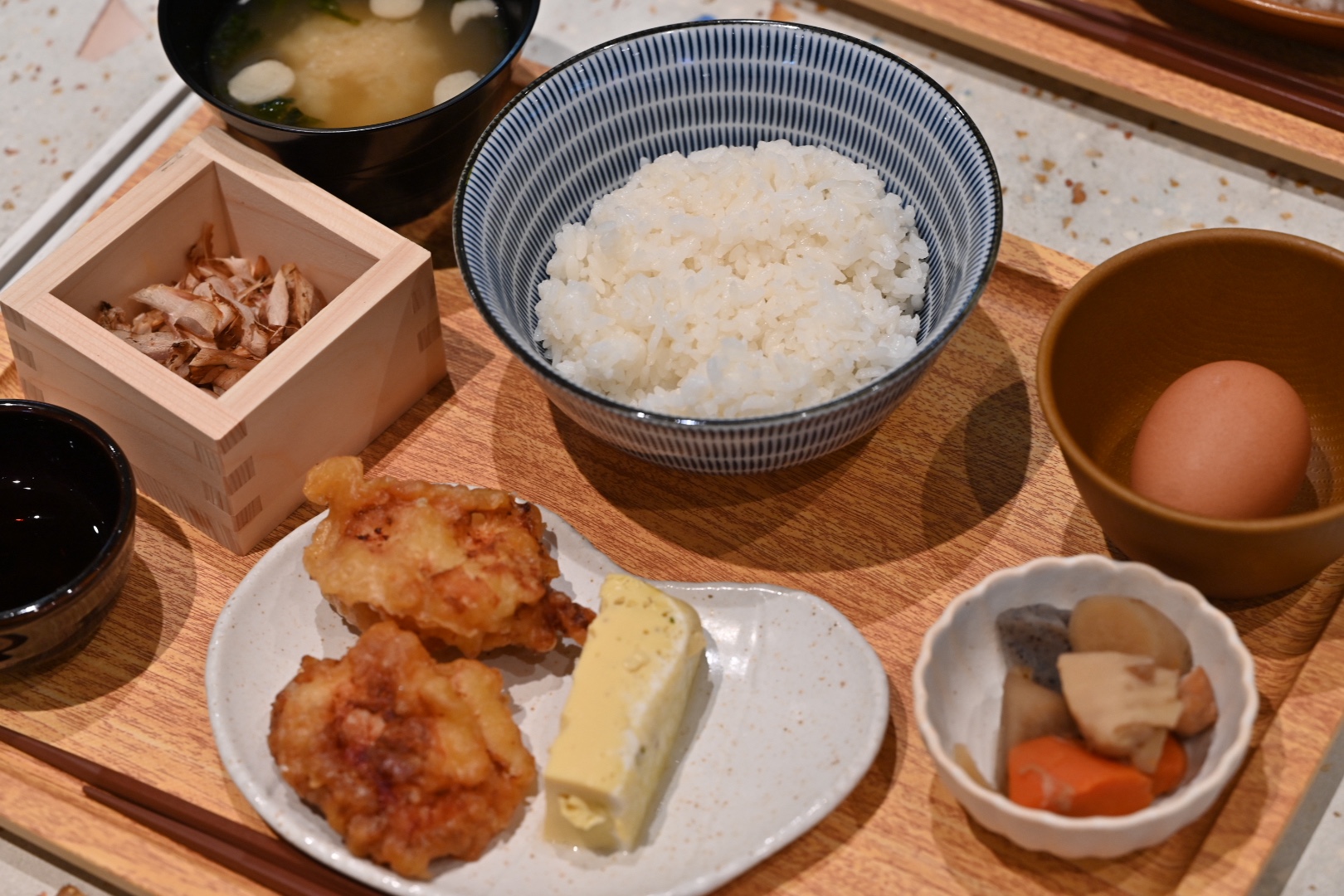 今回は、タニタカフェ+定食のヘルシーとり天のお米は十六穀米(¥1040)と、究極の卵かけご飯定食のから揚げ(¥940)を注文。