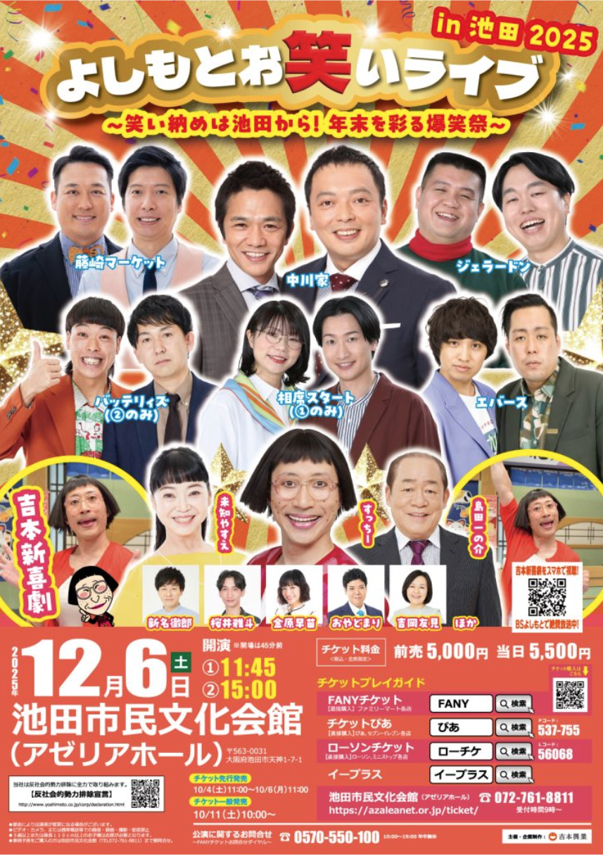12/6(土)、池田市民会館(アゼリアホール)でよしもとお笑いライブin池田2025が開催されるようです!