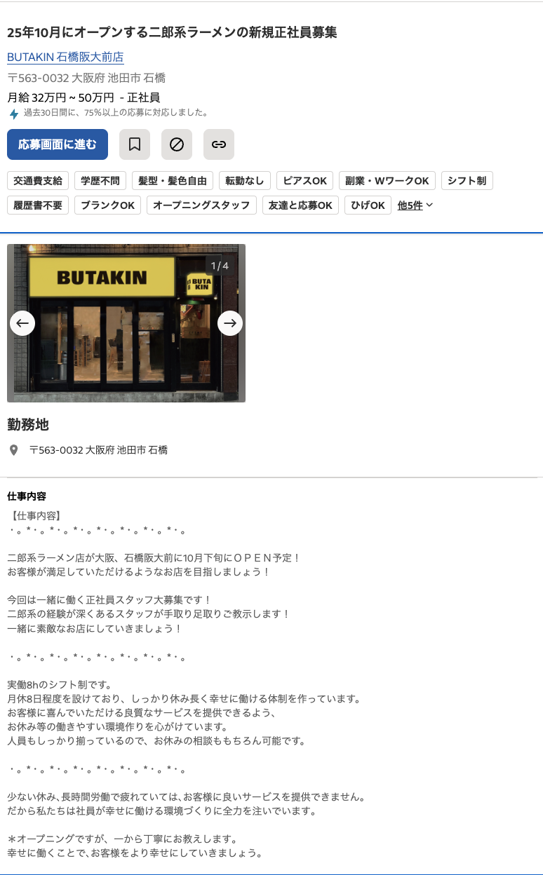 インディードの求人情報によると、2025年10月下旬、池田市石橋2-2-13に、二郎系ラーメン BUTAKIN石橋阪大前店がオープン。