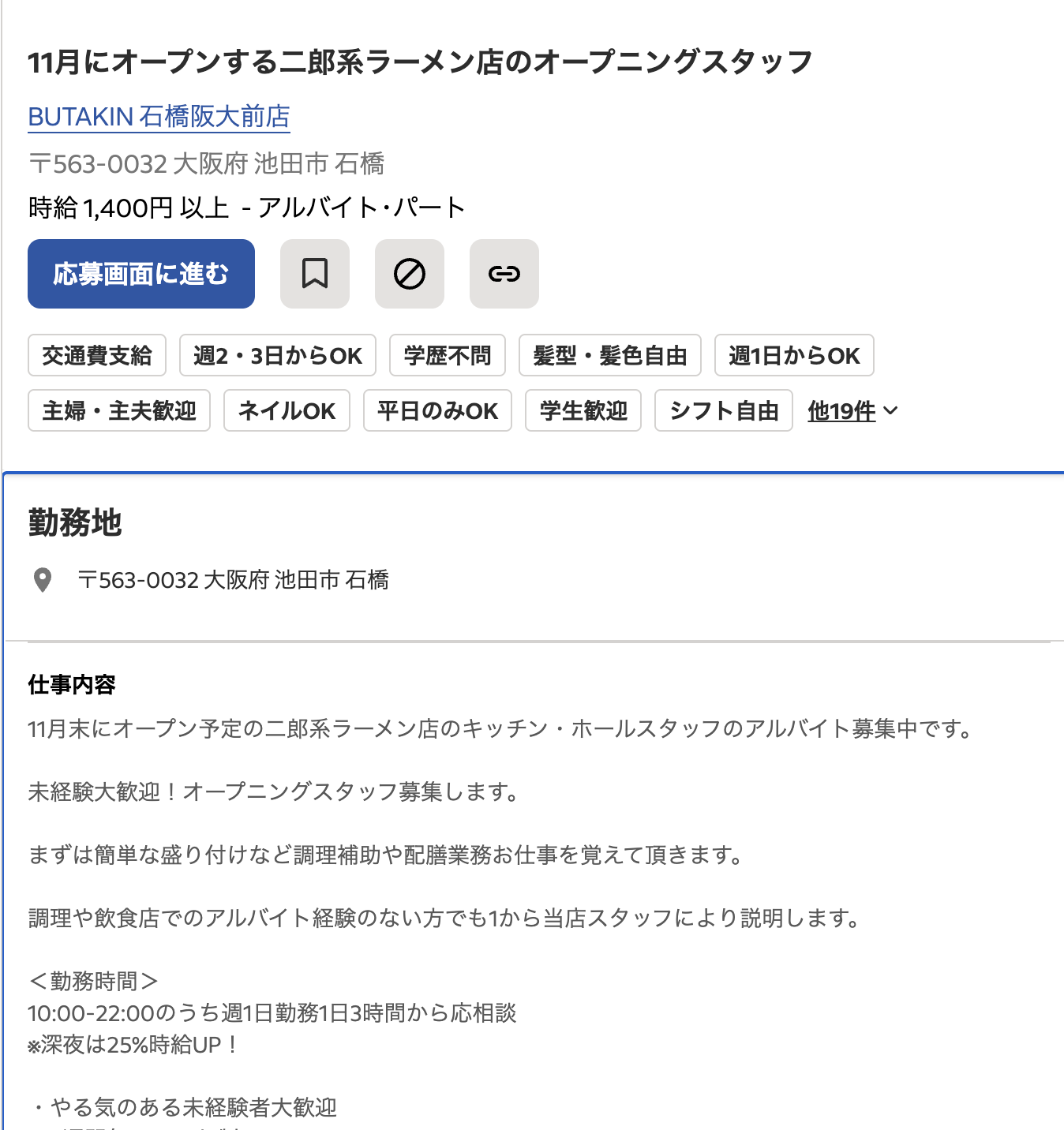 インディードの求人情報によると、2025年11月末、池田市石橋2-2-13に、二郎系ラーメン BUTAKIN石橋阪大前店がオープン。