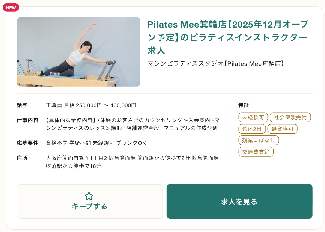 求人情報によると、2025年12月、Pilates Mee 箕輪店がオープン(箕面の間違いと思われます)