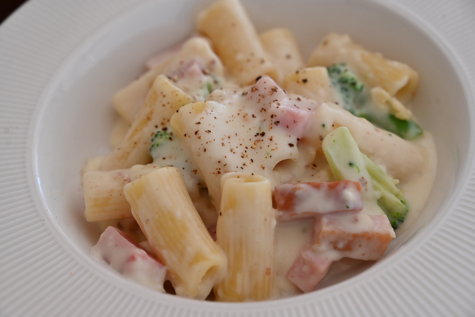 ベーコンとブロッコリーのホワイトソースショートパスタ。