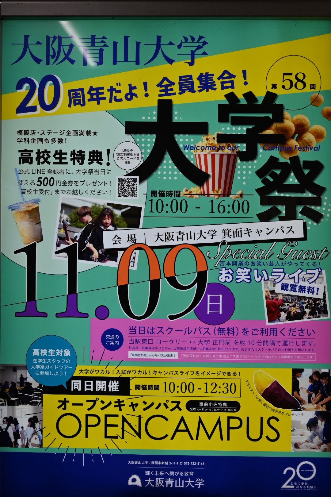 11/9(日)、大阪青山大学箕面キャンパスで、大阪青山大学20周年だよ!全員集合!第58回大学祭が開催されるようです!