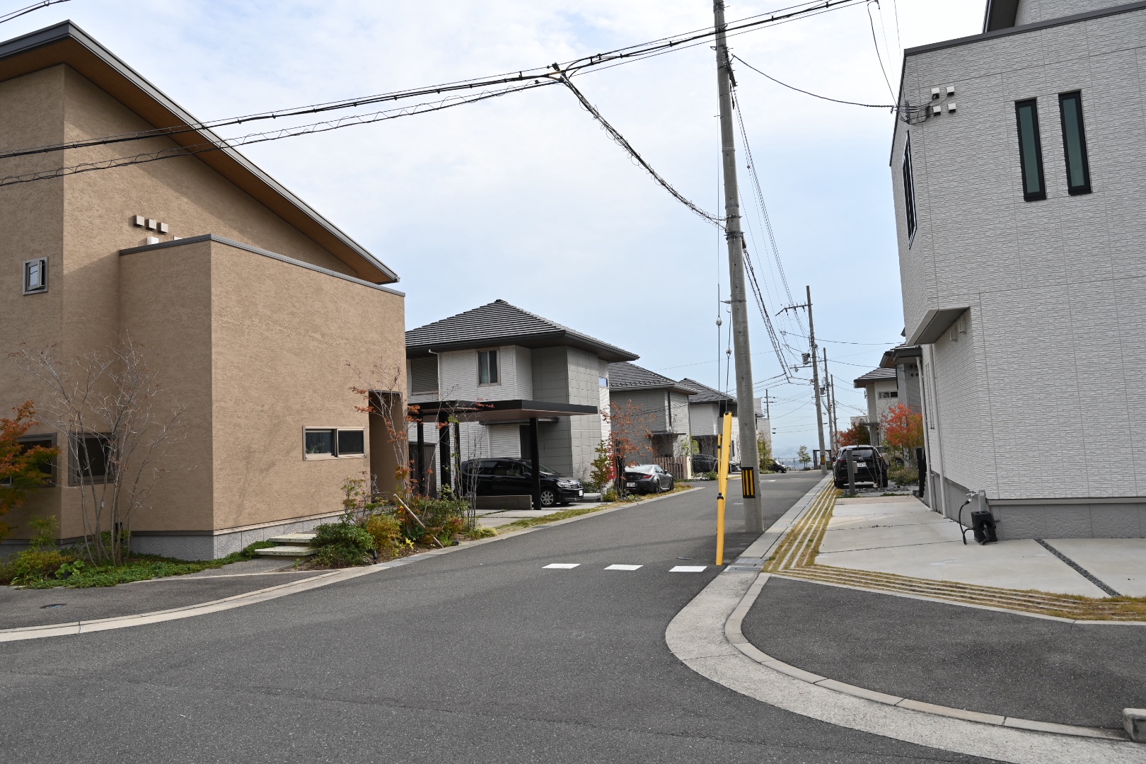 現地は綺麗な戸建住宅が並びますが、すぐ目の前の山の斜面には木々が生い茂り、撮影中、木の影からはガサゴソと何か動物らしきものが動いている音もしていました。