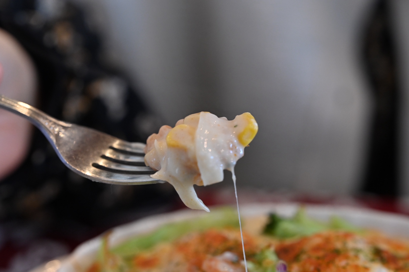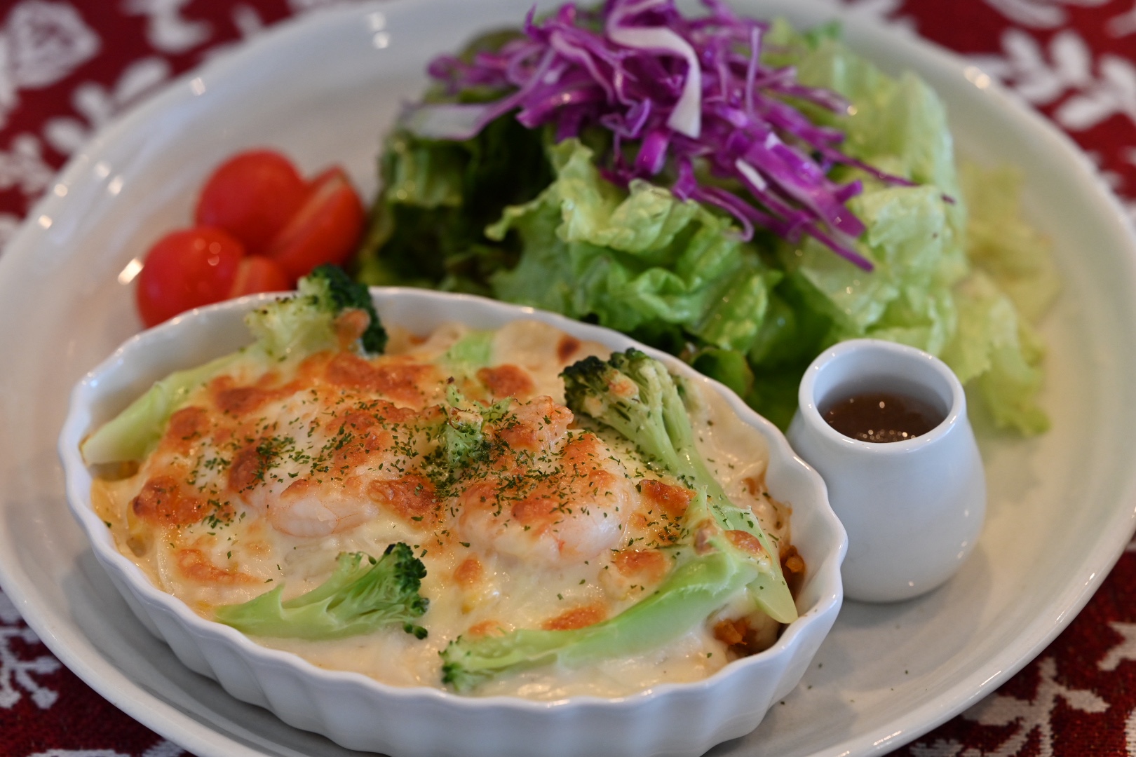 自家製ぺシャメルソースにコーンや玉ねぎ、にんじん、鶏肉、ケチャップライスにブロッコリー、エビとチーズなどが乗っかっています。