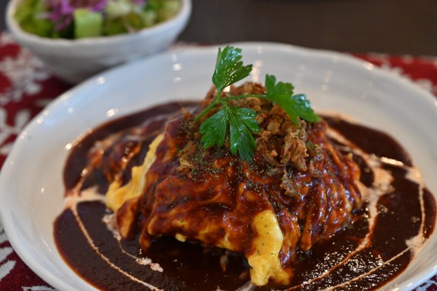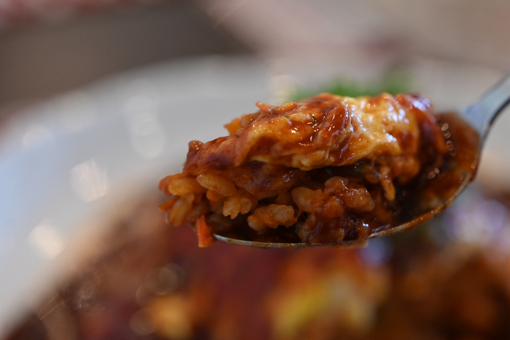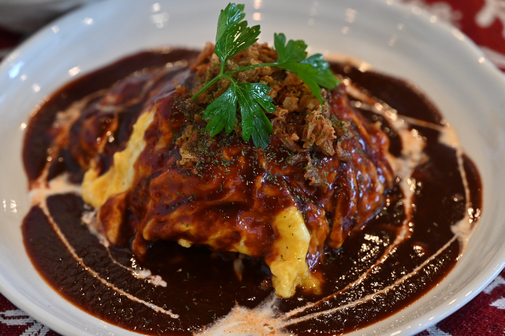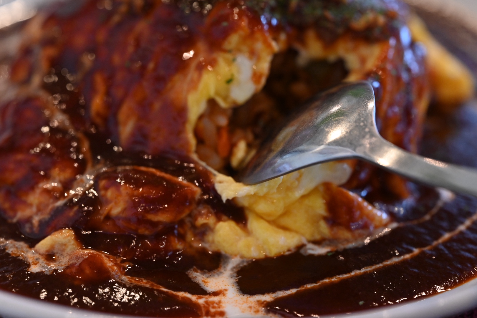 酸味をちょっと感じるデミグラスソースに、卵とケチャップライスが組み合わさります。