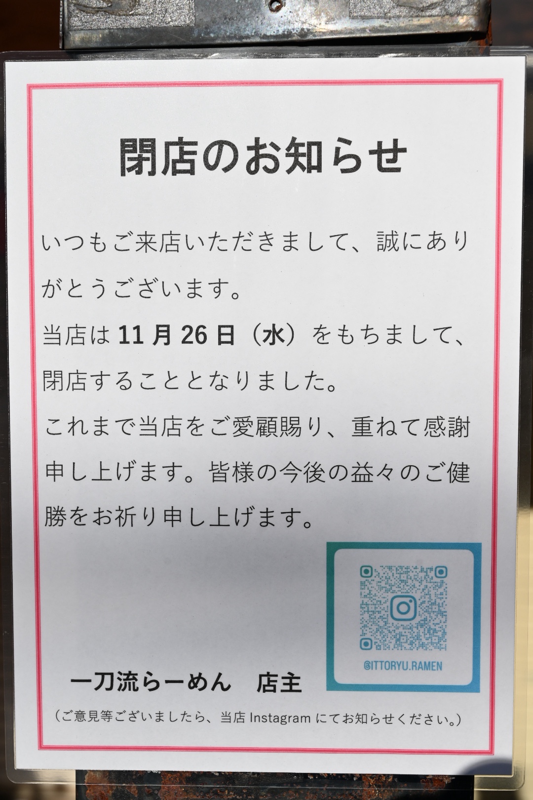 11//26(水)、石橋阪大前駅西側にあった一刀流らーめんが閉店したようです。