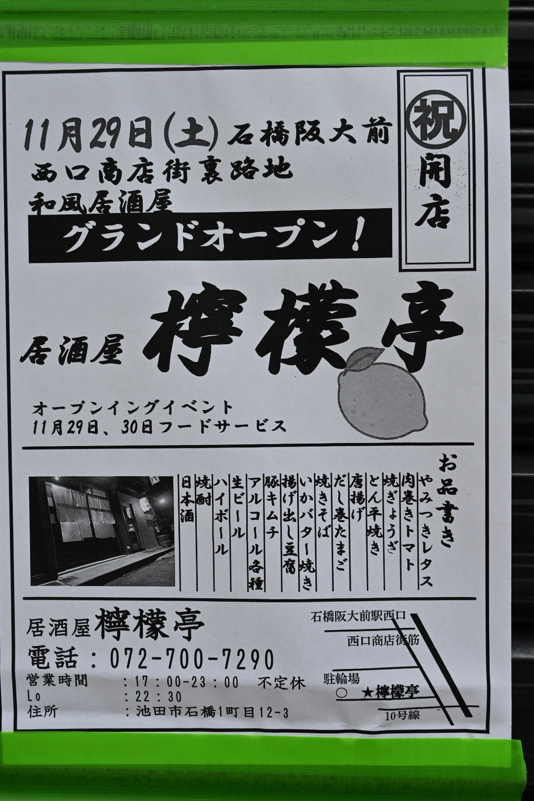 11/29、石橋阪大前駅西側に居酒屋檸檬亭っていう居酒屋がオープンしたようです!