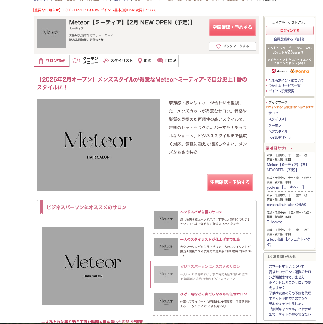 ホットペッパービューティによると、2026年2月、箕面市桜井駅前に新しく、Meteor(ミーティア)という美容室がオープン。