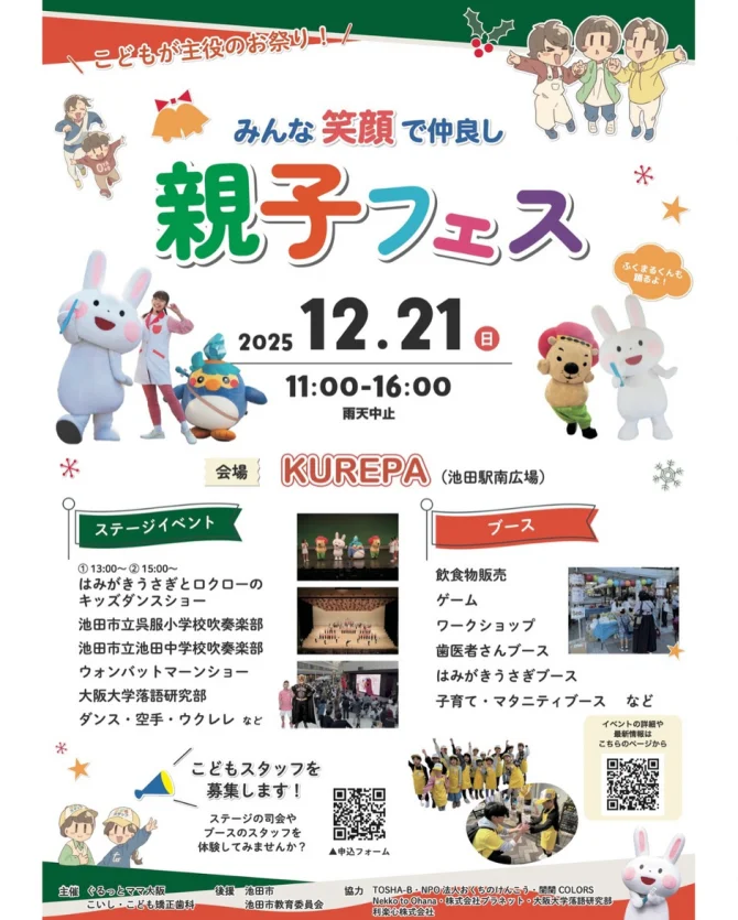 12/21(日)、池田駅南広場でみんな笑顔で仲良し!親子フェスが開催されるみたい。