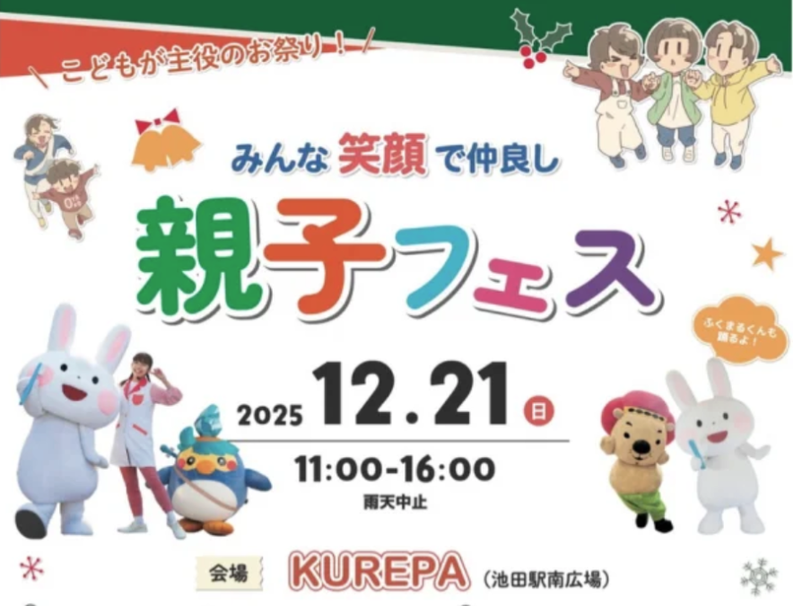 12/21(日)、池田駅南広場でみんな笑顔で仲良し!親子フェスが開催されるみたい。