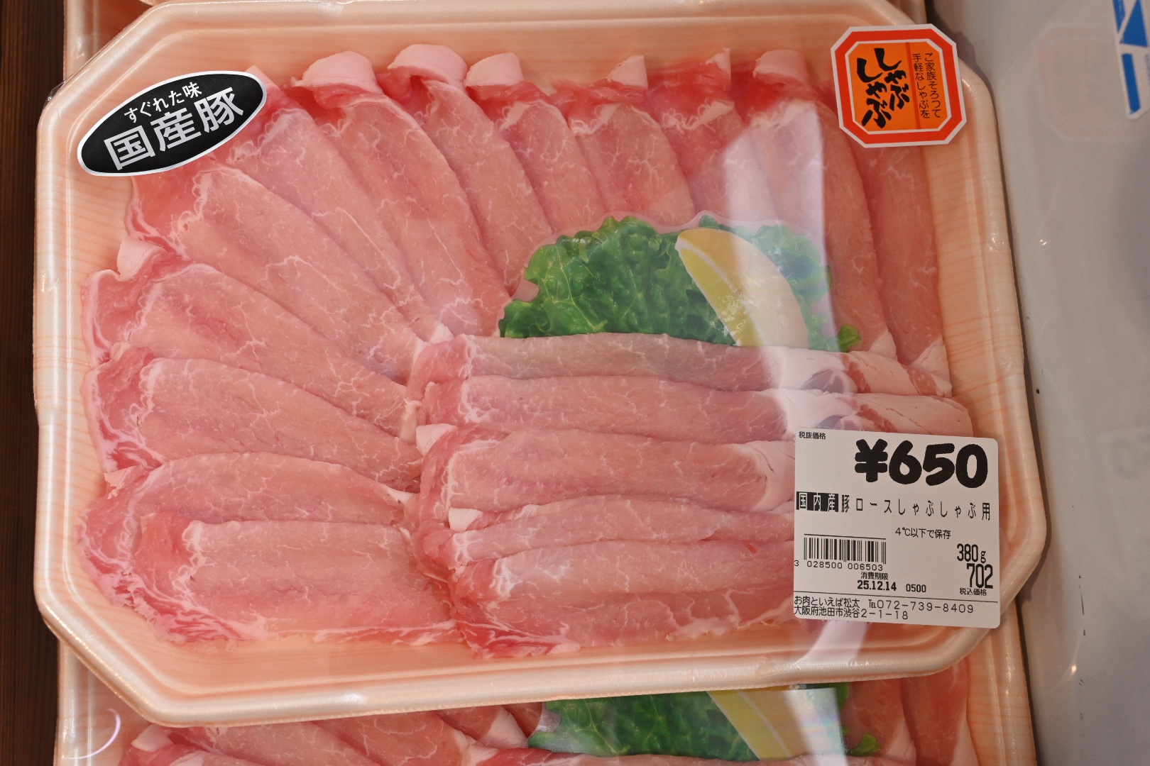 国内産豚ロースしゃぶしゃぶ用 380gで650円。