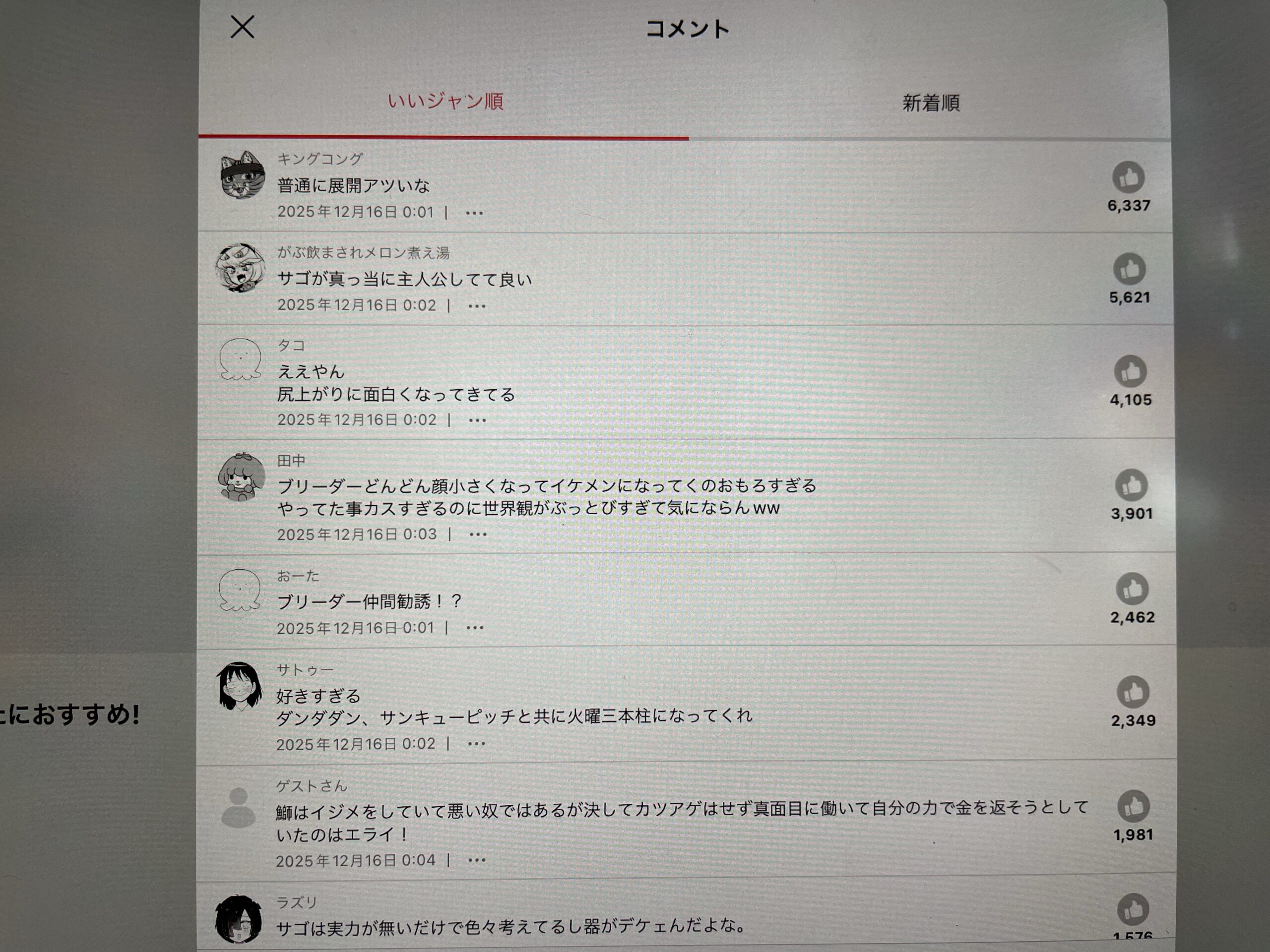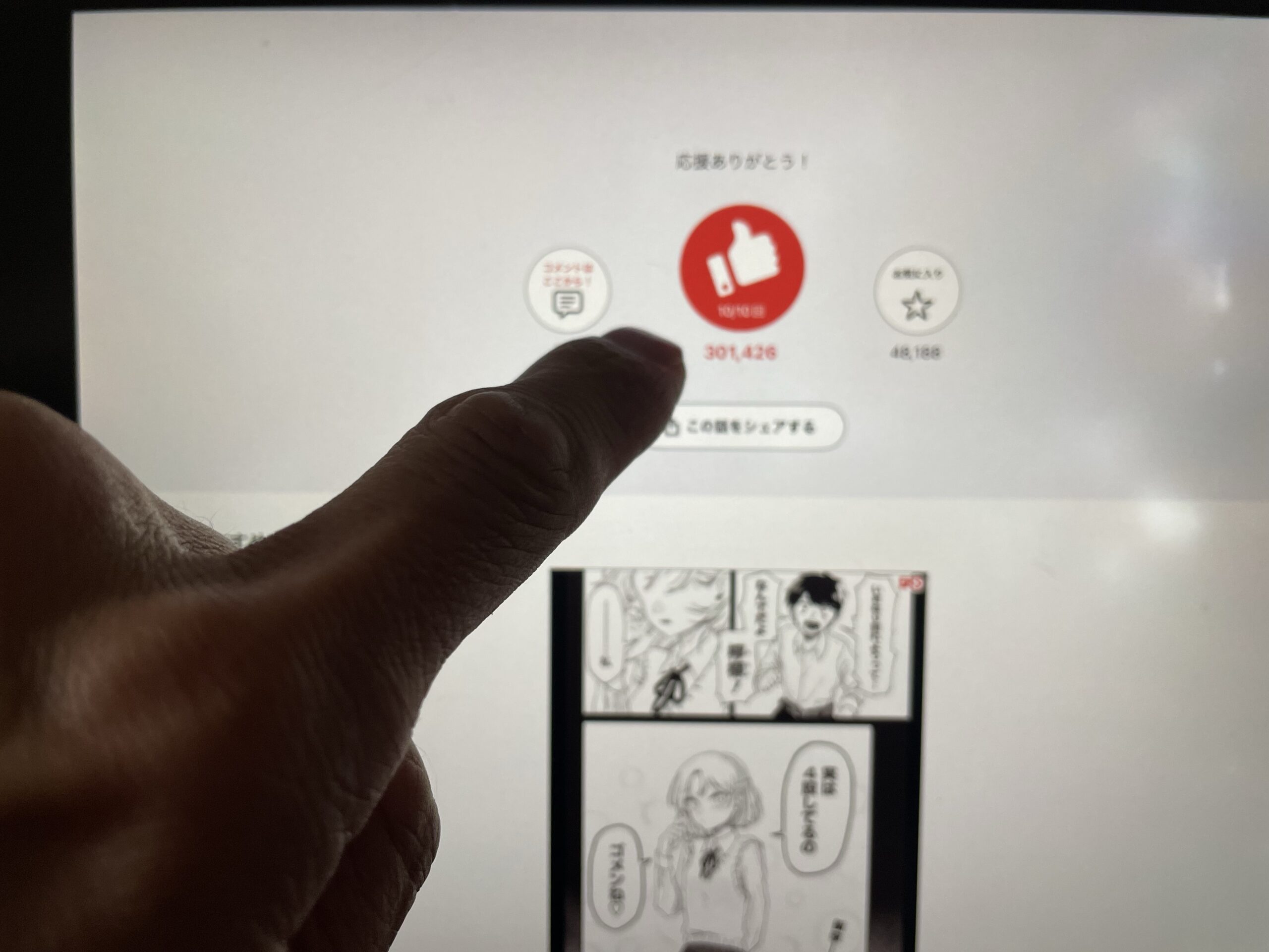 ジャンプ+の作品には応援機能があって、各話の終わりにいいねボタンが表示されます。