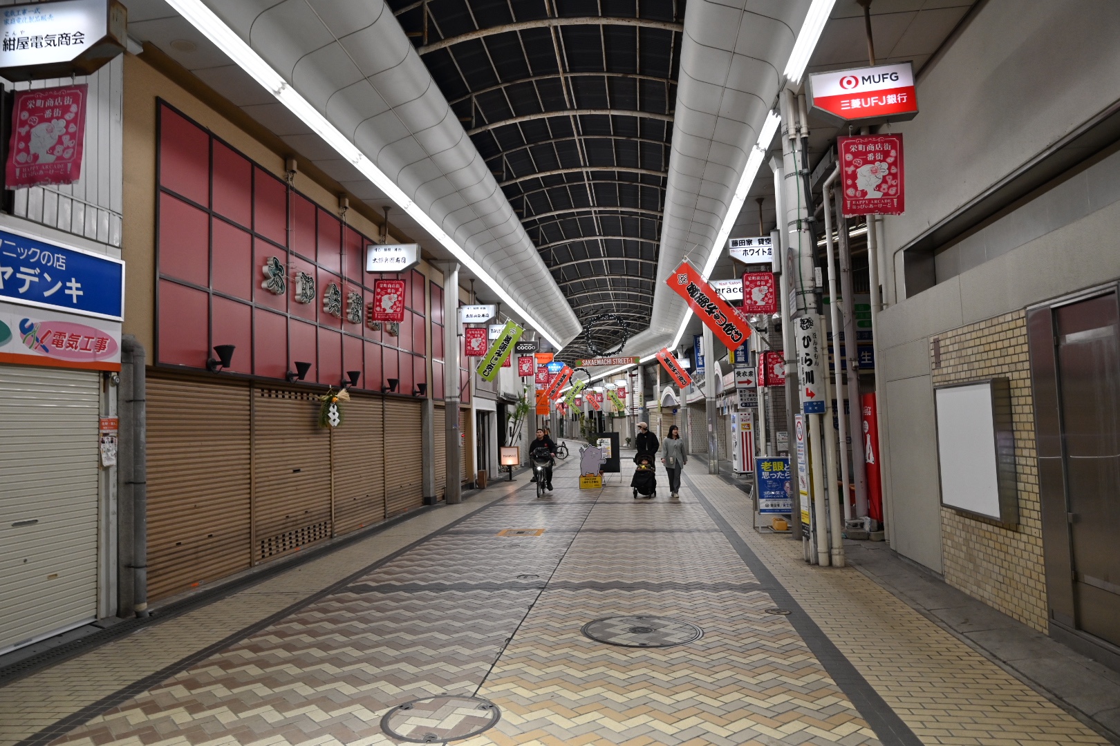 道路の南側を見ると、いつもに人で賑うお店が軒並みお休みしていて、いつもの活気はありません。