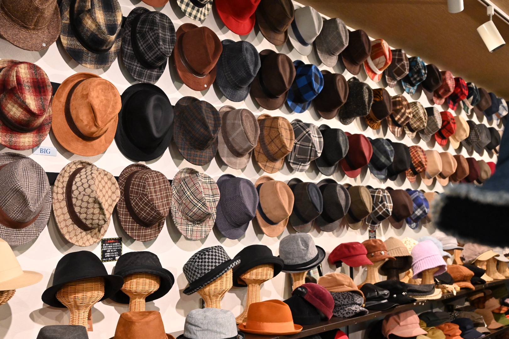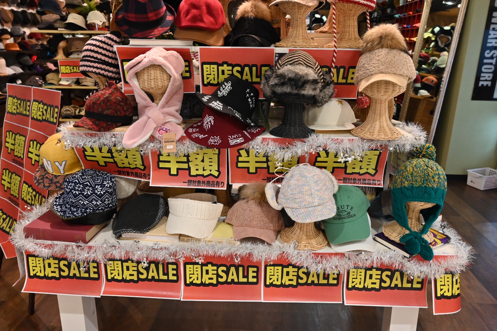 写真に写っているのは一部で、店内にはまだまだたくさんの帽子が売っていて、それらが半額セールになっています。