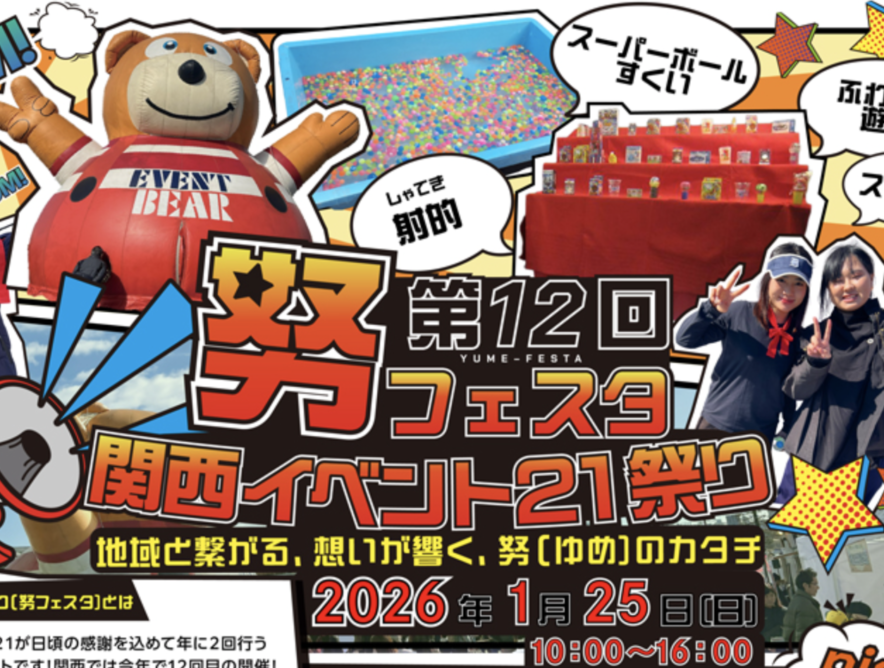 1/25(日)、みのおキューズモール 箕面市立かやの広場で「努(ゆめ)フェスタ第12回関西イベント21祭り」が開催されるようです!