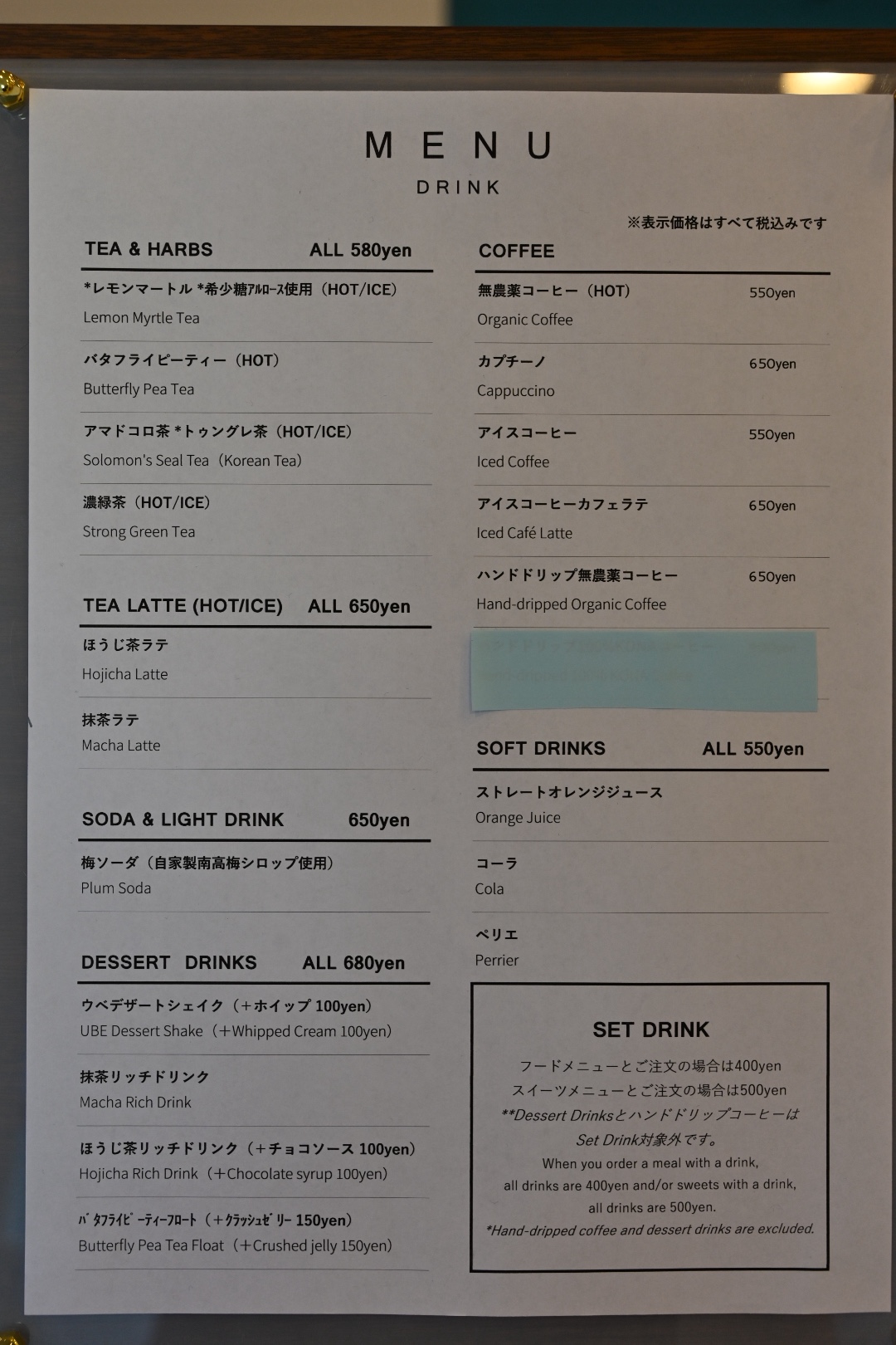 ドリンクメニュー。