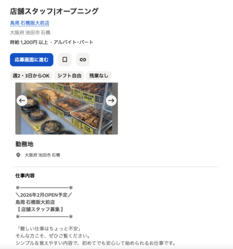 インディードの情報によると、『2026年2月OPEN予定 鳥周 石橋阪大前店【 店舗スタッフ募集 】』となっています。