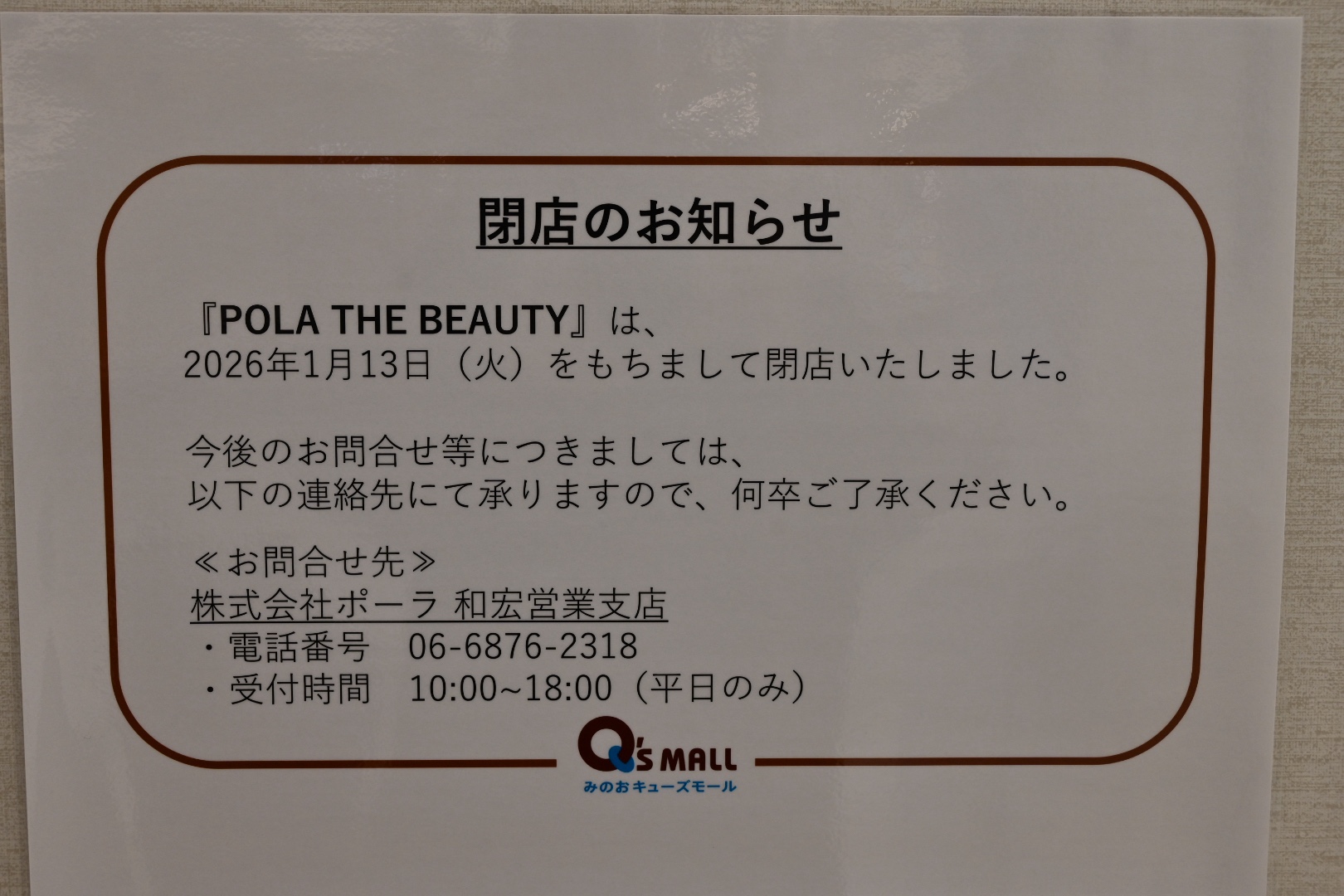 みのおキューズモールのPOLA THE BEAUTYが1/13(火)で閉店したみたい。