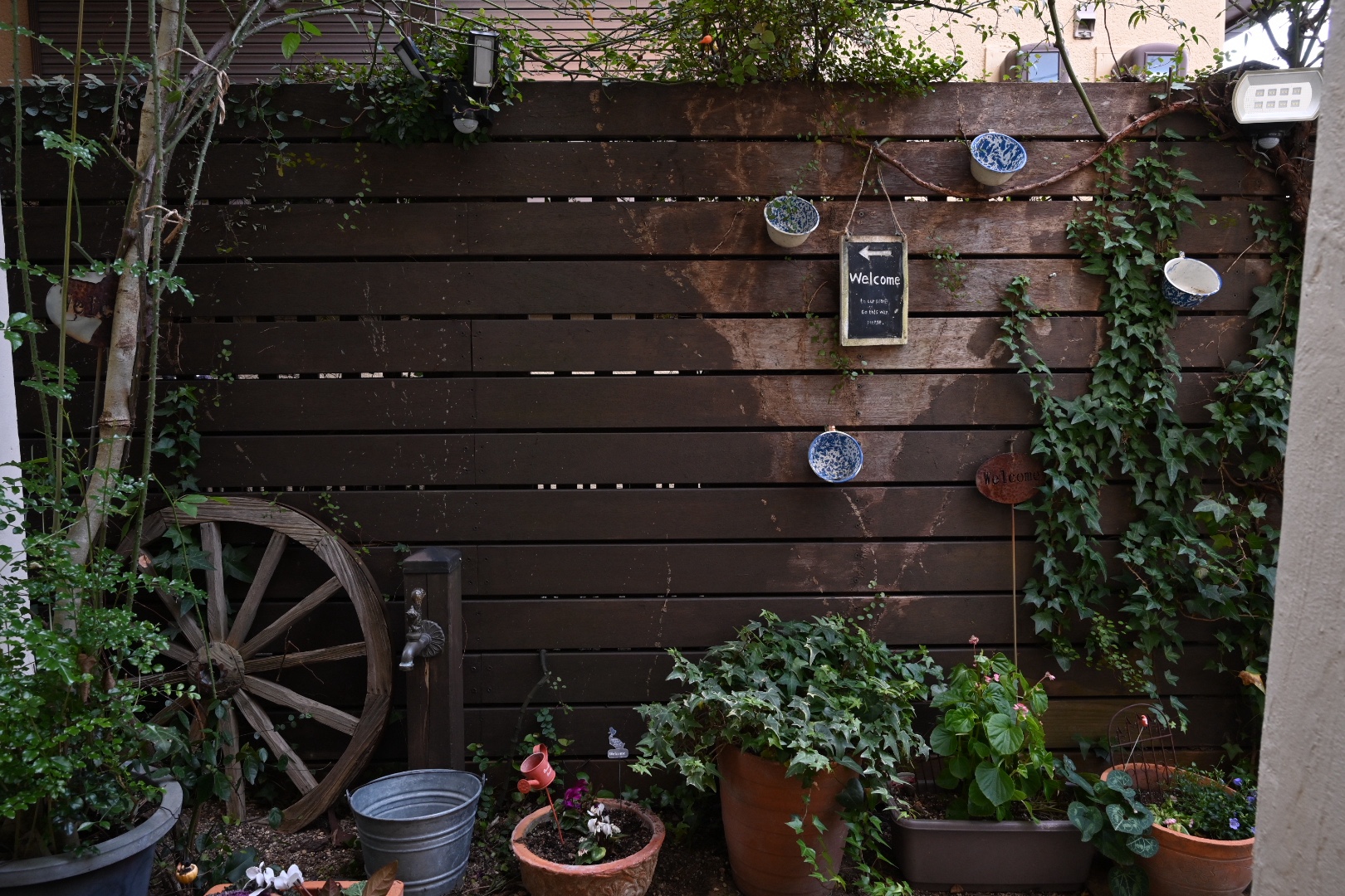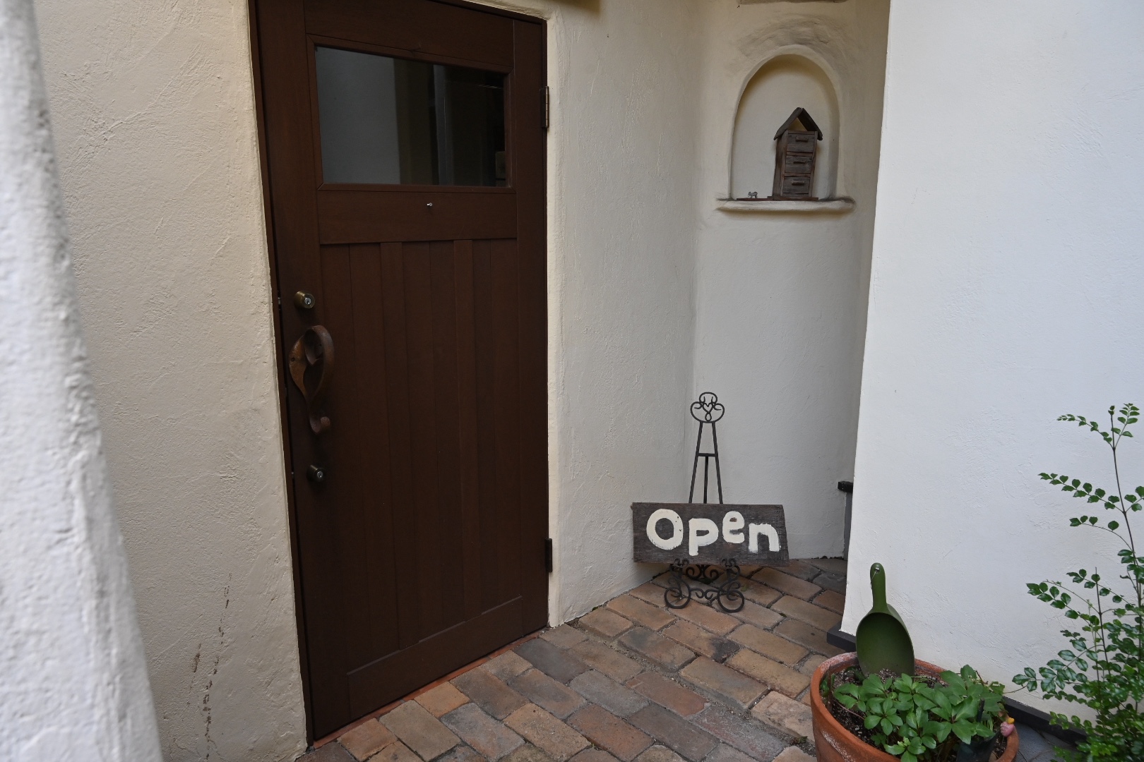入口から反対側の壁は、木の温かみと緑がいい感じに配されてとても良いです。