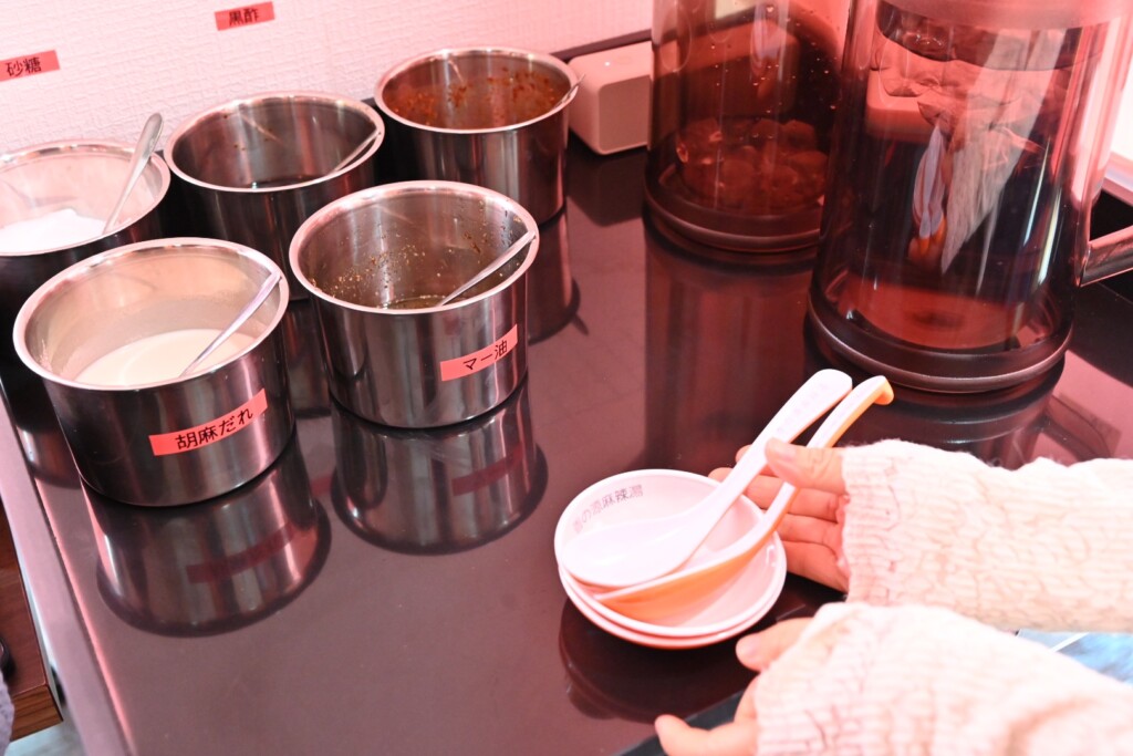 胡麻だれやマー油などの味変用の調味料やお水などはセルフサービスになります。