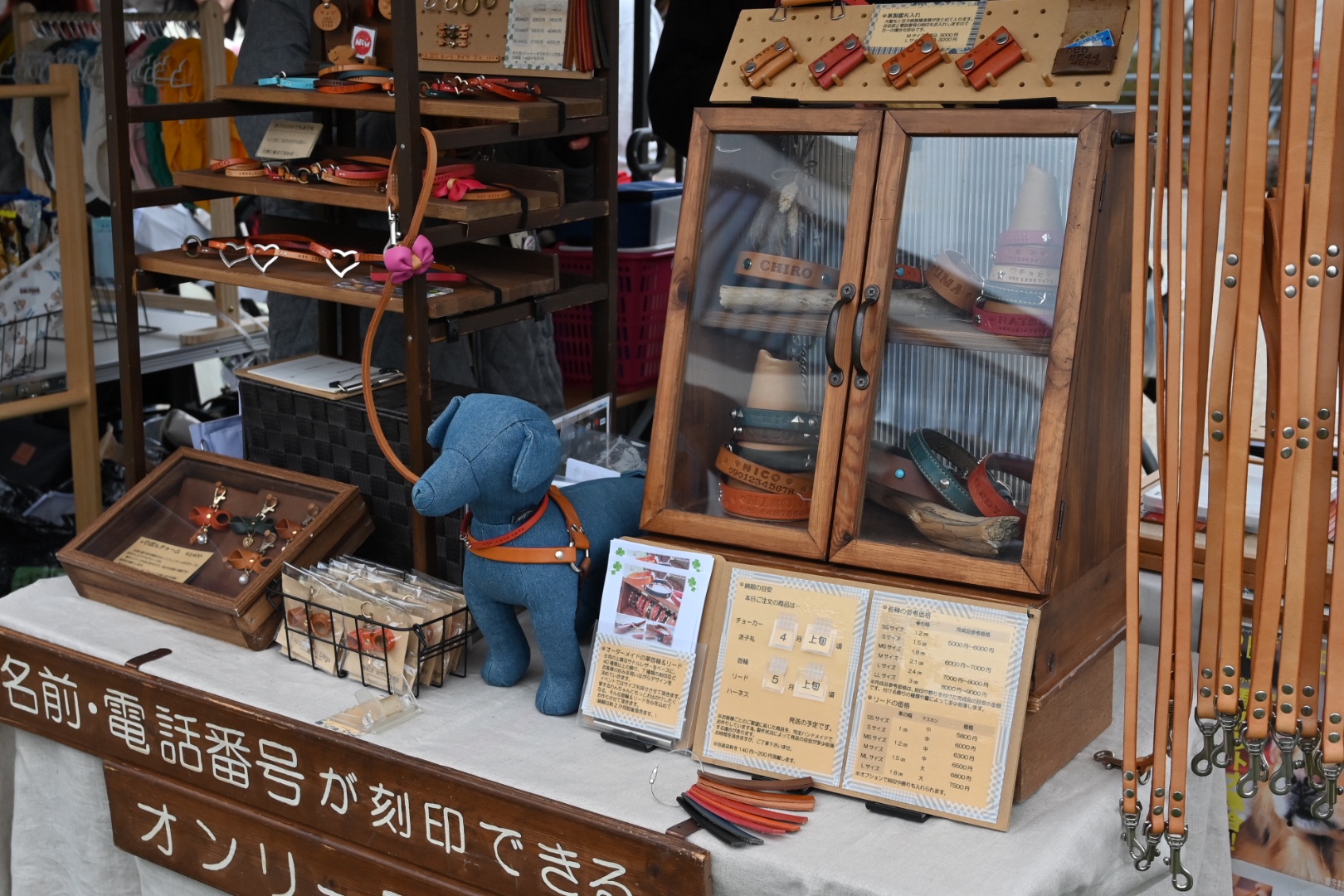 こちらは名前、電話番号が刻印できる革製の首輪やリードを売ってました。