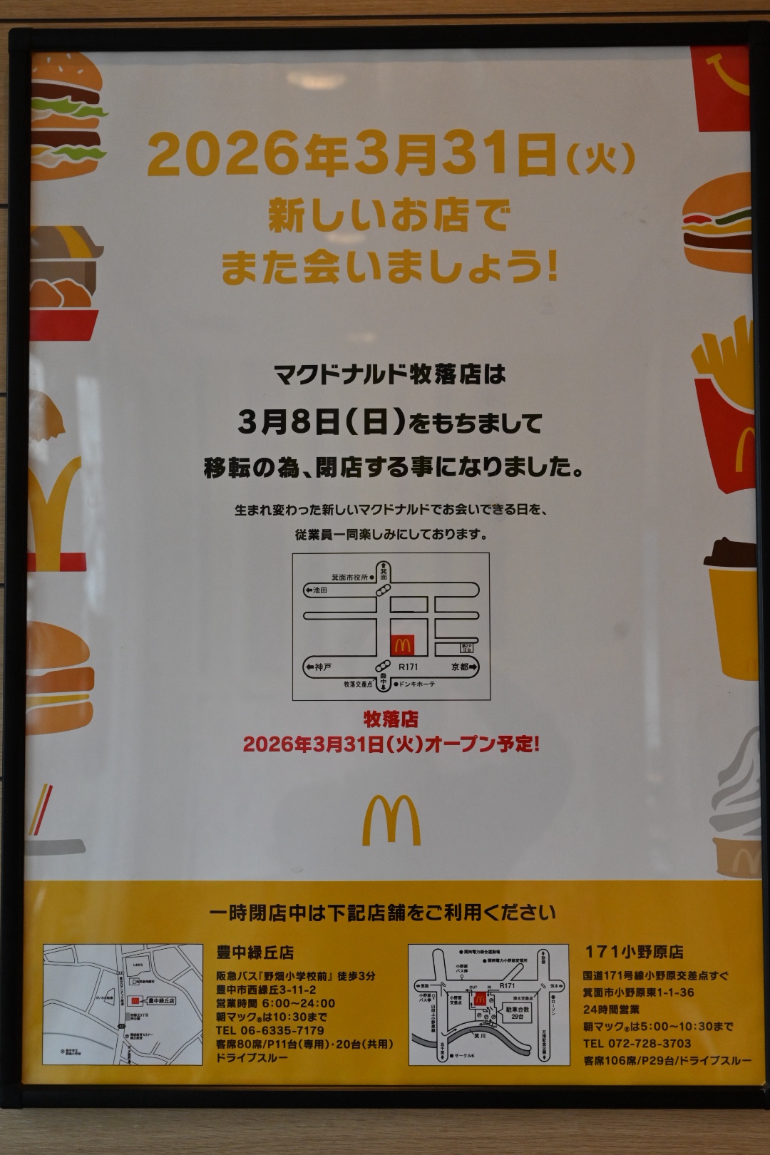 箕面市牧落のマクドナルドが今日(3/8)で閉店します。