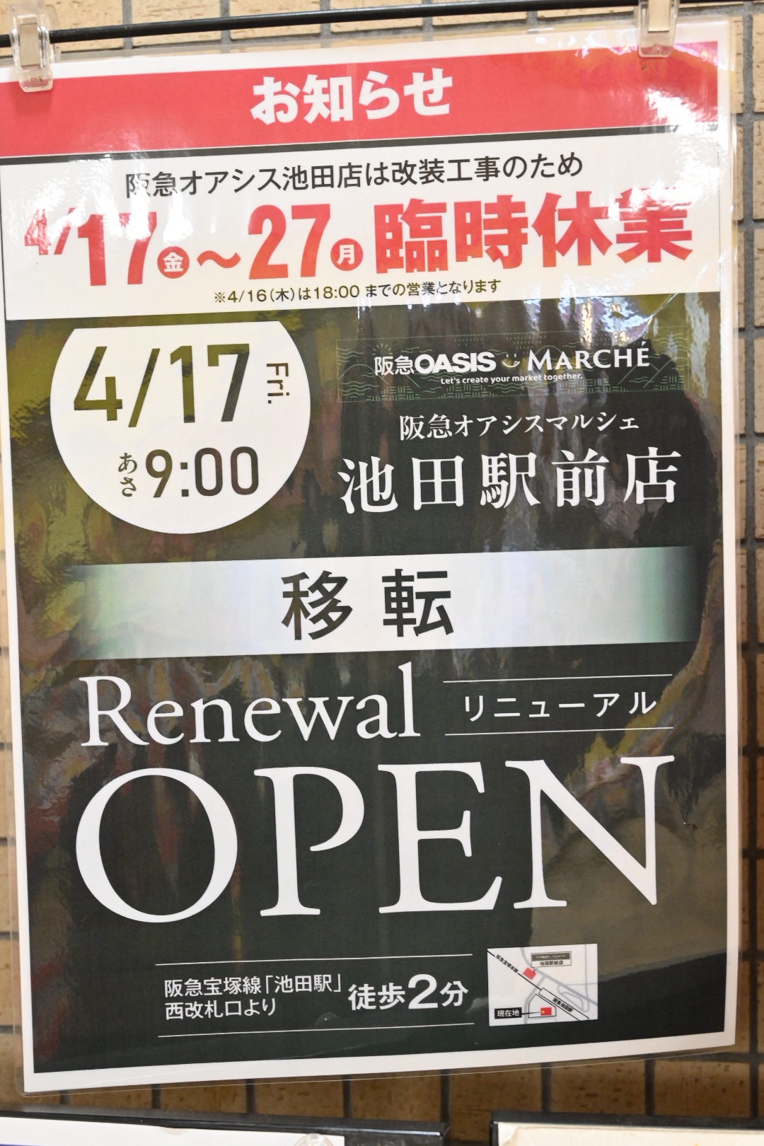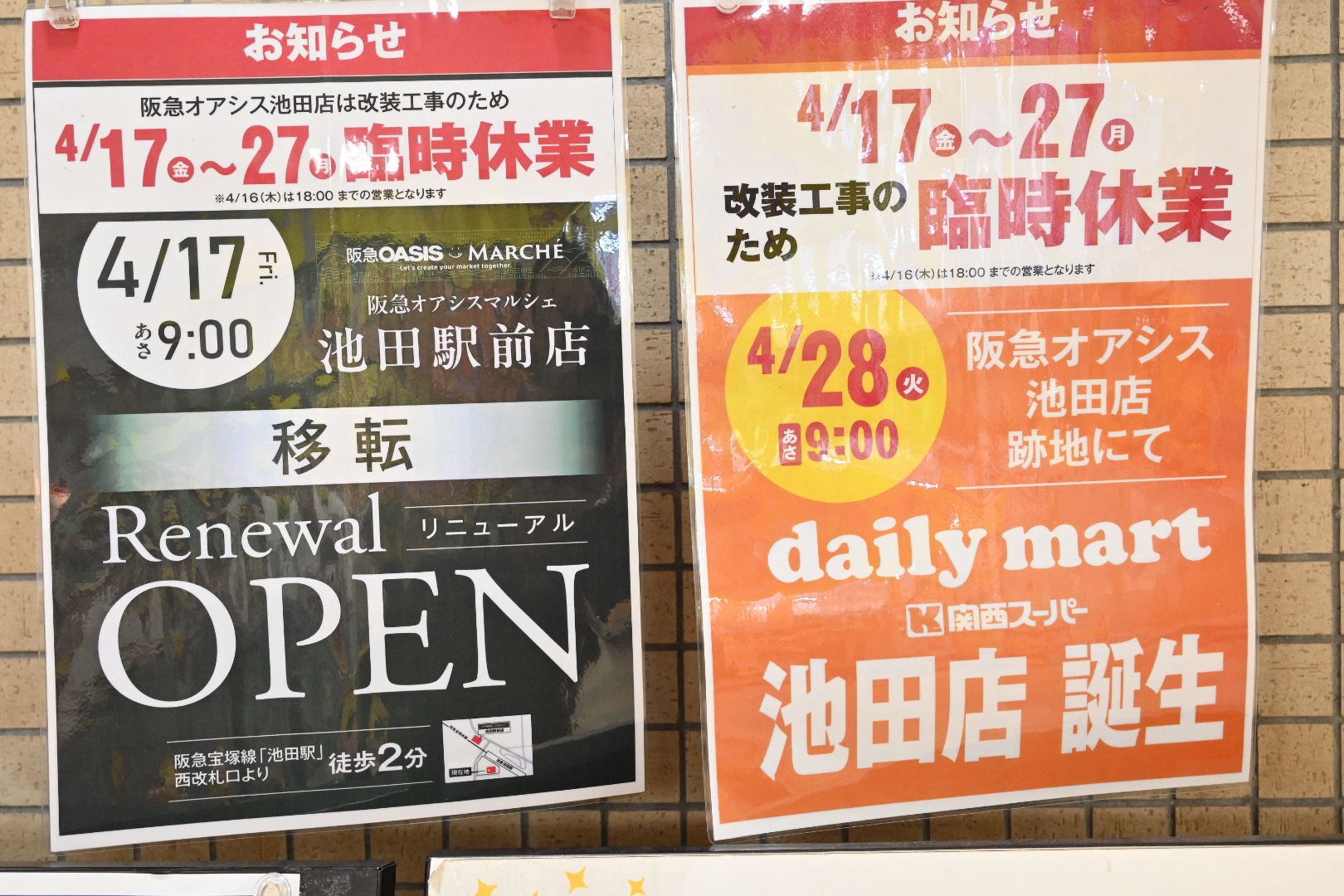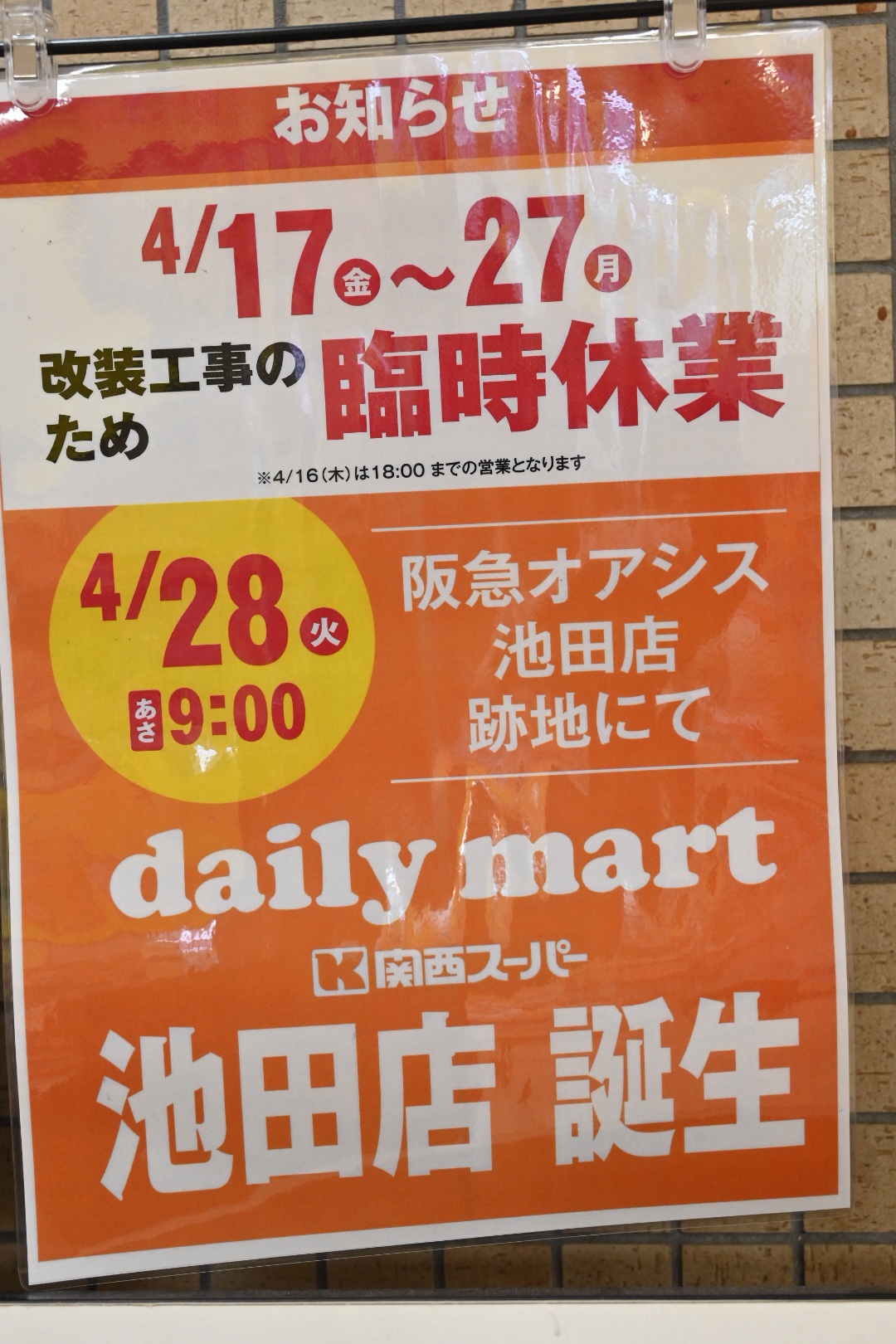 サンシティ地下の阪急オアシスは関西スーパーデイリーマート池田店として4/28(火)にリニューアルするようです!