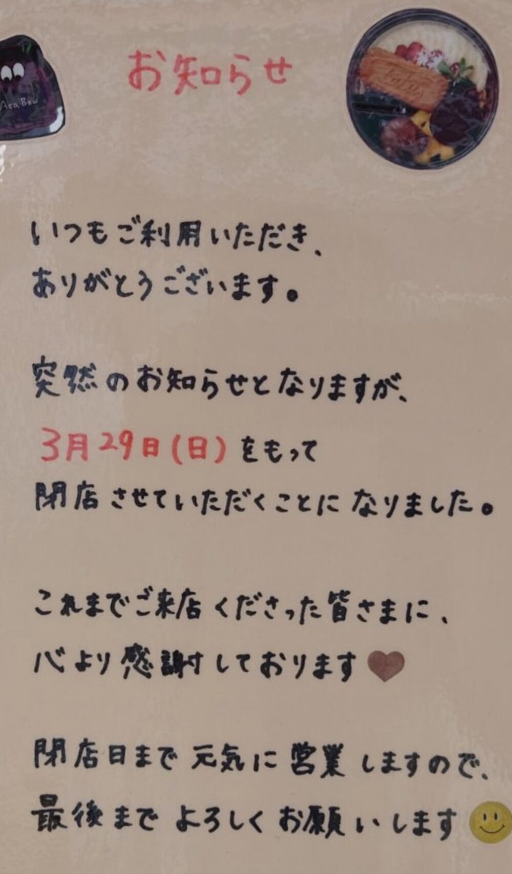 3/29(日)で閉店してしまっていたようです。