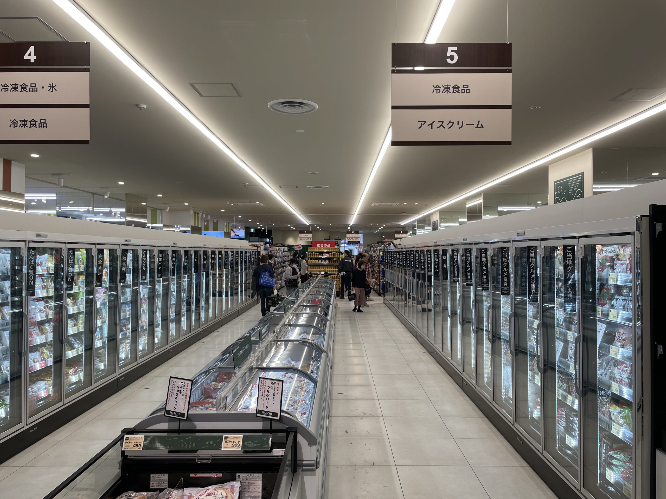 少し移動して、冷凍食品コーナーは最近多い見やすい縦型にレイアウトされたもの。
