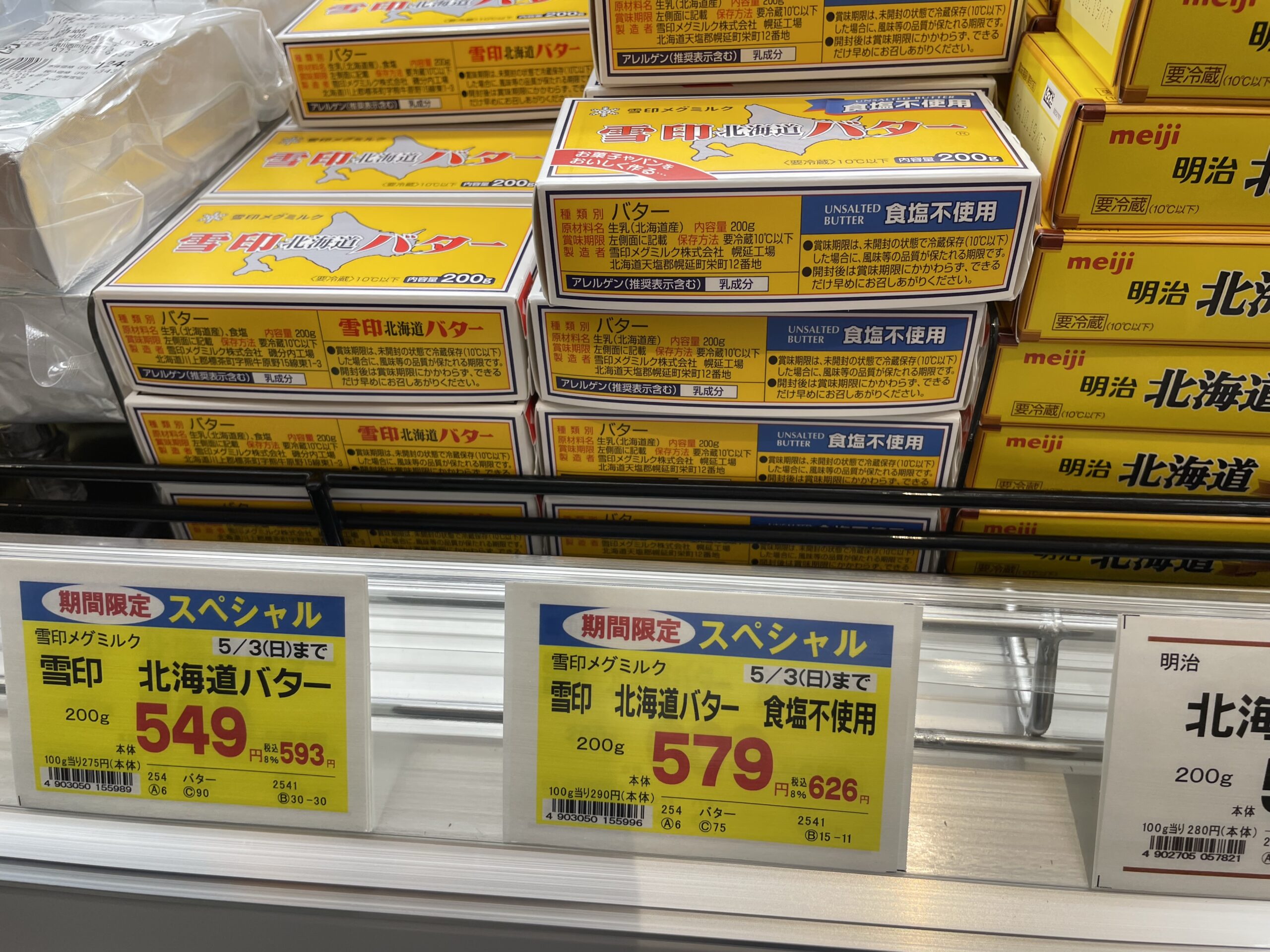 雪印 北海道バター(写真左)が税込で600円を切るのは最近ではかなりレアです。