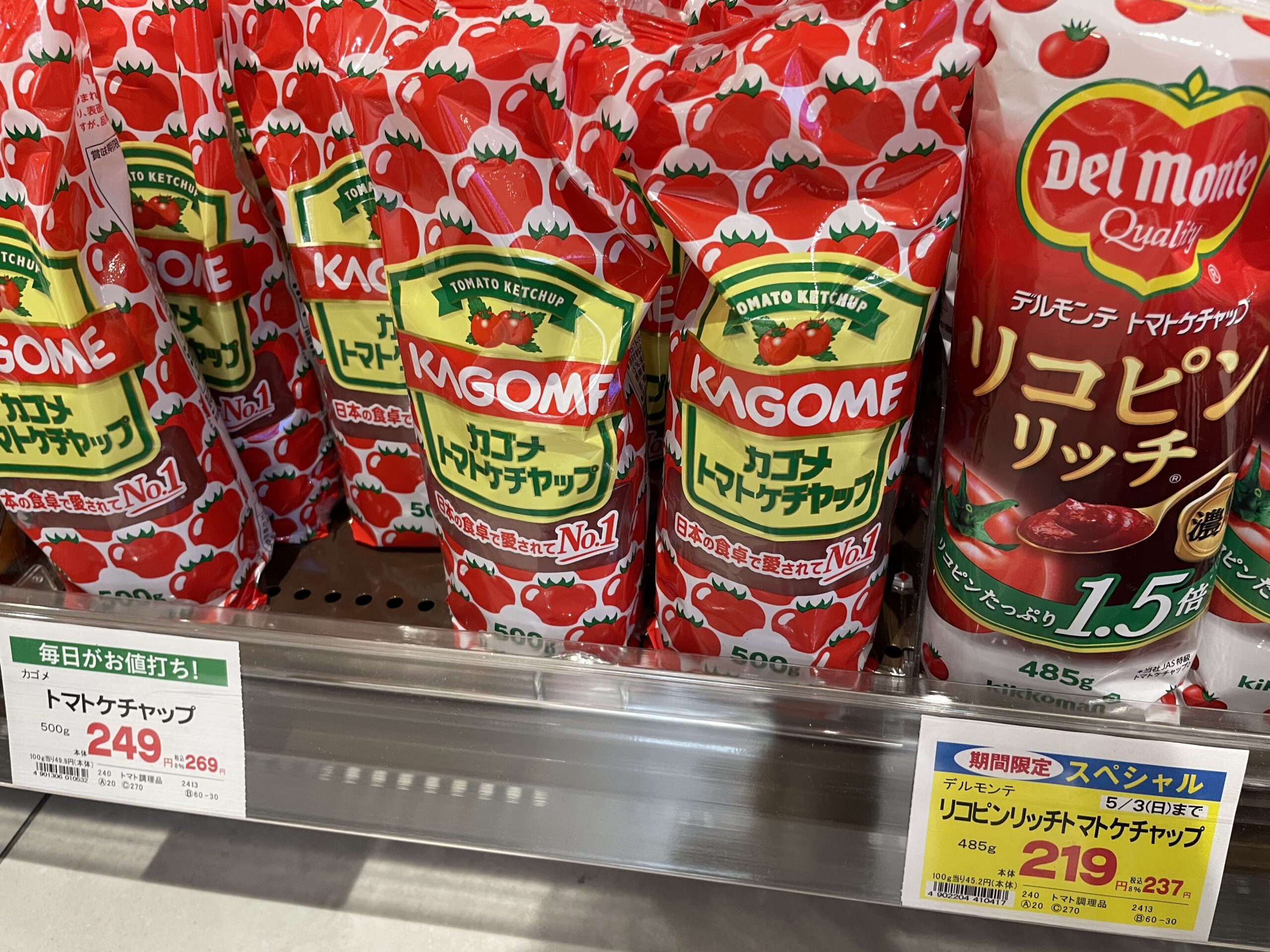 KAGOMEのトマトケチャップ(500g)は249円。