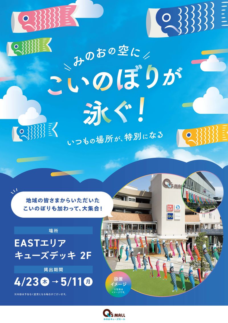 4/23(木)〜5/11(月)まで、みのおキューズモールにこいのぼりが初掲揚がされるようです!